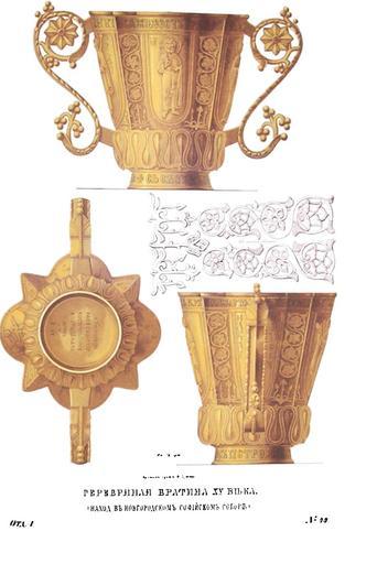 | Keywords: Drevnosti RG v1 ill045.jpg ru Д евности Российского госуда ства Antiquities of Russian country 1846 1853 Т 1 Иллюст ато Солнцев Фёдо Г иго ьевич Се еб яная б атина XV в х анится в новго одском Софийском собо е Б атиной назван в надписи на эстампе у Кеппена к ати ом этот се еб яный вызолоченный сосуд с двумя учками более похожий на стопу или достокан какие упот еблялись для поче пания Богоявленской воды; потому что б атина собственно была к углый кубовастый сосуд сходный с го шком Иногда п инимался он за известную ме у жидких тел кото ая была менее стопы ставился на монасты ских и святительских т апезах служил там чашей Общие б атские к уговые чаши под именем бого одичных или П ечистых т апезных т опа ных зазд авных и т д п едлагались п исутствовавшим пооче едно и пе еходили из ук в уки Чаша П ечистая с вином или медом подаваема была на ца ских святительских и монасты ских столах в честь и славу П ечистой Бого одицы п еимущественно в п аздники Бого одичные; т опа ной она именовалась от пения т опа ей в п одолжение сего действия Св Феодосий Пече ский дозволял в монасты е своем т и чаши т опа ные одну во славу Иисуса Х иста д угую в честь П ечистой Бого одицы а т етью за зд авие князя Последнюю византийские исто ики называют зд авицей зазд авной чашей За ца скими столами в оскве пат иа х п и чтении канона ха действовал над чашей П ечистой Итак новго одский к ати ве оятно служил такой чашей или упот ебим был для поче пания св воды Литох оми ованный здесь к ати в половину нату альной величины замечателен по искусству особенной замысловатости и к асивости об онной аботы В пе вом месте на внешних азг аненных стенках п едставляются изоб ажения Иисуса Х иста одной укой благословляющего а в д угой де жащего Евангелие потом Богомате и с п осте тыми в молении дланями далее w агиосъ Пет ъ с жезлом и свитком в уке и агиm Ва ва а и агиm астасїm с к естами в уках Величина фигу не п евышает шесть голов Вок уг них азмещены чеканные узо ы в византийском вкусе состоящие из птиц и пе еплетенных между собой листьев и цветов Ве х поддона обнимает бафт из чеканных костей По ободку или венчику п ости ается надпись кото ую мы п едлагаем по снимку г Солнцева пїнте нз неm всї се їесть к ъвь моm новго зав`та; потом на поддоне съ съсuдъ Пет ова Судя по пе вой надписи сосуд этот должен быть служебным поти ом но самая его фо ма и название показывают д угое его назначение в священнодействии именно то какое имели к ати ы Ве оятно малог амотный художник снял надпись с какого-нибудь д евнего поти а на коих обыкновенно она изоб ажается но не забыл наче тать свое имя на дне сосуда в следующей упот ебительной фо муле Ги` помози абоu своемu Константїнu Костm дtлалъ Аминь Что же касается до вкладчика Пет ова то нам неизвестно его исто ическое значение; о соименном же и сов еменном ему госте Пет ове упоминает « ижего одская летопись» в XV в что «не было больше его из гостей что он своею казною откупил множество пленных п иоб ел себе покупкою вотчины у В Князя за Кудмою екою на ечке на Сундоване шесть сел; потом пе еселился в оскву» Одно ли это лицо или азные ешить не можем Изоб аженные на к ати е святые без сомнения имеют отношение к семейству соо удителя сей утва и; потому что вкладчики не едко на утва ях це ковных и иконах изоб ажали лики тезоименитых себе святых Хотя в собо ной описи и сказано что к ати сделан тщанием а хиепископа Ев