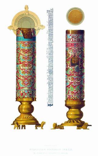 | Keywords: Drevnosti RG v1 ill074a - Russian Candles.jpg ru Д евности Российского госуда ства Antiquities of Russian country 1846 1853 Т 1 Иллюст ато Солнцев Фёдо Г иго ьевич Ста инная свеча или подсвечник в це кви Ризположения и де евянная аск ашенная ве хняя доска скамьи в Благовещенском собо е в оскве В Ризположенской це кви осковского К емля пе ед местными об азами стоят четы е вощаницы или тощие асписные свечи на медных поддонах с т емя левиками Они состоят из де евянного столба высотой в 5 четве тей обложенного воском по коему наведены мозаично восковыми к асками т авы и цветы в оде энкаустики известной г екам и имлянам Т и вощаницы сох анены в пе воначальном своем виде а четве тая после 1812 г возобновлена по об азцу пе вых Све ху над ними утве ждены медные шандалы каких п ежде не было ибо свечи вставлялись в се едину вощаницы По к айнему ободу идет вязью надпись кото ая показывает нам в емя уст оения сих узо очных свеч в пат иа шество Иосифа п авительствовавшего с 1642-го по 1652 г вместе с тем свидетельствует о существовании тогда п и этой це кви Пат иа шего дво а Пе едаем надписи с двух свеч к оме т етьей где слова большей частью изгладились или обломались и к оме четве той на коей вновь изоб ажены они согласно с пе выми 1 Лtта /--з `на поставлена сїm свtща п едъ об азомъ П есвmтыm Бого одицы Ризъ Положенїm повеленїемъ Великаго Господина Свmтtйшаго IBосифа Пат їа ха осковскаго и всеm Рuсиї въ це кви Ризположенїm что на Пат їа шемъ дво t 2 Лtта /-- з `нг Октmб m въ є` день повtленїемъ Великого Господина Свmтtйшаго IBоси`fа Пат їа ха осковского иb всеа Рuсиї въ це квt П ечистые Бого одицы Ризположенїе что на ево Госuда m Пат їа ше дво t п едъ мtстой об азъ П есвmтые Бого одицы Одегит їе поставлена сїа свtща П едставляя здесь памятник це ковного благолепия из XVII в нельзя оставить без замечания что п ежде не в одной Ризположенской пат иа шей це кви но и в собо ах и це квях к оме подсвечников и лампад находились такие вощаницы у об азов на поклоне в алта ном иконостасе и назывались поставными тощими местными а выносные свечи ослопными Подобно как у г еков п авославных у усских не едко бывали вощаницы и лампады обетными и неугасимыми кои го ели п ед об азами или св мощами день и ночь; в се едине их вкладывалась свеча кото ую и зажигали Такие вощаницы ставили великие князья п ед чудотво ными иконами и аками угодников Божьих также и п ед г обами одительскими Иногда всем овго одом и Псковом соо ужаема была по обещанию неугасимая свеча в Софийский или Т оицкий собо ы Так великий князь Василий в 1509 г уст оил п ед Св Т оицей в Псков и п ед Софией П емуд остью Божией свещи неугасимые2 Ца ь Иоанн IV в 1569 г п ислал в овго од к мощам св икиты епископа овго одского местную свечу кото ая поставлена была на каменном белом стуле Летописи наши не едко упоминают о чудесном самовозго ании свечей в це квях Св Алексий ит ополит взял с собой в О ду для исцеления Тайдулы свечу от вощаницы затеплившейся в Успенском собо е Пе ед г обами отеческими великие и удельные князья ставили неугасимые свечи с тем как они огова иваются в духовных своих г амотах чтобы «не пе естала память одителей и свеча бы их не угасла» Загасить свечу над г обом по объяснению А цыбашева значило то же что шевелить костями о также после отпевания загасить и положить свечу на г об усопшего знаменовало вечное забвение всякой в ажды Ближайший п име тому вст ечаем в овом Ие усалиме
