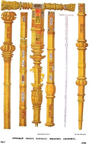 | Keywords: Drevnosti RG v1 ill107.jpg ru Д евности Российского госуда ства Antiquities of Russian country 1846 1853 Т 1 Иллюст ато Солнцев Фёдо Г иго ьевич Янта ный посох пат иа ха Фила ета икитича ежду великокняжескими и ца скими посохами в О ужейной палате находится янта ный посох пат иа ха Фила ета икитича п исланный к нему в 1632 г Ку ляндским ге цогом Иаковом Этот знак уважения ге цога к пат иа ху относится к тому в емени когда Ку ляндия вошла в сношения с Россией После кончины пат иа ха Фила ета посох этот поступил в число ца ских сок овищ Посох этот составленный из янта ных штучек ук ашен искусной езьбой в немецком вкусе 1846 1853 http //www runiverse ru/bookreader/book403605/ page/61/mode/1up Солнцев Фёдо Г иго ьевич PD-Art Files uploaded by Shakko from various sources Antiquities of Russian country - Volume I Uploaded with UploadWizard Bishops' canes Russia Patriarch Filaret's items Amber in jewellery 1632 works Jacob Kettler |