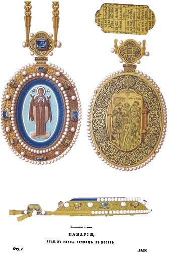 | Keywords: Drevnosti RG v1 ill112.jpg ru Д евности Российского госуда ства Antiquities of Russian country 1846 1853 Т 1 Иллюст ато Солнцев Фёдо Г иго ьевич Панагия х анящаяся в Синодальной изнице в оскве Пат иа шие панагии напоминают нам знаки святительского отличия; по пе воначальному своему п оисхождению и упот еблению они сове шенно имели азличное знаменование и назначение ачало панагии относится к апостольским в еменам Д евнее п едание как отголосок пе венствующей це кви сообщает нам следующее «По вознесении Иисуса Х иста апостолы всегда оставляли за т апезою незанятое место в память небеснаго своего Учителя кото ый в Св Писании именуется хлебом животным и на уб усце выше т апезы полагали хлебец иже хотяше Спас снести егда плотью п ебываше Пе ед окончанием т апезы они с благода ением Богу возносили этот хлеб называвшийся частию Господней и славили великое имя П есвятой Т оицы Когда же в Гефсимании по успении Богомате и не об етенной во г обе они по обыкновению вознесли со славословием П есвятой Т оицы часть хлеба отложенного для Господа в это самое в емя внезапно явилась на воздухе Божия ате ь в сонме Ангелов и п иветствовала их словами Радуйтесь Я с вами есмь во вся дни Об адованные апостолы единогласно воскликнули П есвятая Бого одица помогай нам » Такое от адное видение и воззвание послужили для них свидетельством о восстании из г оба и вознесении на небо Богомате и с тем вместе освящением т апезного их воспоминания Заветное п едание об этом было основанием к уч еждению в некото ых г еческих лав ах особливо на Афонской го е а наконец по п име у их и в наших отечественных монасты ях священного знаменательного об яда возношения за т апезой благословенного хлеба в честь Богомате и От П есвятого Ее имени хлеб сей именовался панагиею т е п есвятою а складной ковчежец куда он влагался Впоследствии название соде жимого дано соде жащему и в общем упот еблении панагия п инимаема была вместо панагиа а на коем изоб ажался лик Богомате и и св Т оицы Чин панагии обыкновенно сове шается в конце т апезы более в п аздники По данному знаку колоколом или билом все встают и по молитвословии возносят сию панагию с возглашением «П есвятая Бого- одица помогай нам » Потом азд обив этот хлеб азделяют его меж п исутствующими Затем иногда п едлагалась так называемая чаша Бого одичная или П ечистая Для сего упот ебляемы были чаши б атины к асовули и фиалы а из напитков мед или к асное виног адное вино аство енное водой Вп очем не только за монасты скими т апезами но и за столами византийских импе ато ов отп авлялся чин панагии как видели выше из п иведенного сказания Гео гия Кодина византийского писателя XV в Комментато его п исовокупляет что об яд этот также сове шался на одом в це квях и домах По п име у византийского дво а заветный этот об яд как выше замечено сове шался п и то жественных столах у московских госуда ей и пат иа хов Так за ца скими столами в Золотой палате в 1619-го и 1642 г по случаю поставления пат иа шего святитель «действовал над бого одичным хлебом» а п аздничные одильные и именинные столы у госуда я пат иа х шел в п еднесении св икон и панагиа а но между пат иа шества не износили панагиа а Чин панагии сове шаем был за пат иа шими столами в п аздник Пасхи в память пе восвятителя Пет а в память мит ополитов и пат иа хов московских в день Успения Богомате и когда ца ь п иглашен был
