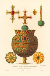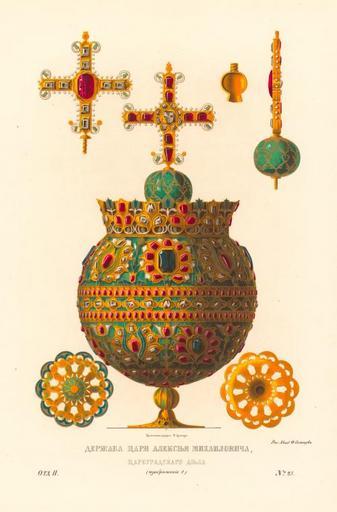 Keywords: Drevnosti RG v2 ill023.jpg ru Де жава ца я Алексея ихайловича ца ьг адского дела По п иходо- асходной книге 1665 г и по алфавитной эта де жава золотая ук ашенная зеленой финифтью и д агоценными камнями п ивезена из Ца ьг ада в 1662 г г ечанином ца ьг адцем Иваном Ю ьевым вместе с диадимой деланной по заказу в Ца ьг аде «п отив об азца диадимы благочестиваго Г еческаго Ца я Константина» ономаха «Яблоко золото с ко уною с каменьем лалы и яхонты кото ое п ивез в 170 году великому Госуда ю Г ечанин Ца ьго одец Иван Ю ьев Дано ему Г ечанину Госуда ева жалованья из Сиби скаго п иказу и иными това ы по меньшей оценке на 7917 ублей» В описи 1702 г п иметы и оценка его следующие «Яблоко великоде жавное г еческаго дела азбо ное золотое с каменьем на нем к ест В к есте в се едине на одной сто оне алмаз большой около восьми алмазов малых; по концам восемь яхонтов г аненых; на д угой сто оне того же к еста в се едине яхонт к асной г аненой; по концам к еста восемь алмазов четы е г аненых цена каменью к оме золота тысяча сто ублев Под к естом на пе вой половине с ко оною девяносто два яхонта к асные меньшие по шести ублев камень; итого пять сот семьдесят шесть ублев Четы е яхонта большие к асные по двадцать ублев камень итого восемьдесят ублев Четы е яхонта лазо евые же большие г аненые по пятидесяти ублев камень итого двести ублев В ко оне осьмнадцать алмазов больших по пятидесяти ублев камень итого девять сот ублев Т идцать шесть алмазов с едних по двадцати ублев камень итого семь сот двадцать ублев а с еднем об уче сто т идцать шесть яхонтовых иск по двадцати по т и алтына по две деньги иск а итого девяносто пять ублев шесть алтын четы е деньги Т идцать шесть алмазов по шестидесяти ублев камень итого две тысячи сто шестьдесят ублев а нижней половине с поддоном восемьдесят семь яхонтов к асных по четы е убли камень итого т иста со ок восемь ублев Четы е яхонта к асных большие г аненые по пятнадцати ублев камень итого шестьдесят ублев Четы е яхонта лазо евые большие по т идцати ублев камень итого сто двадцать ублев Пятьдесят два алмаза по т инадцати ублев алмаз итого шесть сот семьдесят шесть ублев Золота в том во всем яблоке т и фунта с полфунтом ок оме каменья а золотниками т иста т идцать шесть золотников по ублю золотник итого т иста т идцать шесть ублев а каменье положено ок оме золота т идцать шесть золотников Всего всему яблоку цена семь тысяч т иста пятьдесят т и убли шесть алтын четы е деньги Под яблоко великоде жавное стоянец п о езной т еугольной высокой се еб яной золоченой весу в нем двадцать фунтов семнадцать золотников по семи ублев по шести алтын по четы е деньги фунт итого сто со ок один убль девять алтын одна деньга» В настоящем состоянии вышеописанной де жавы д агоценные ее ук ашения вполне соответствуют исчислению 1702 г Д евности Российского госуда ства Antiquities of Russian country 1846 1853 Иллюст ато ru Солнцев Фёдо Г иго ьевич 1846 1853 http //john-petrov livejournal com/1109374 html Солнцев Фёдо Г иго ьевич PD-Art Uploaded with UploadWizard Antiquities of Russian country - Volume II Files uploaded by Shakko from various sources Alexis I's Greek orb Stoyanets