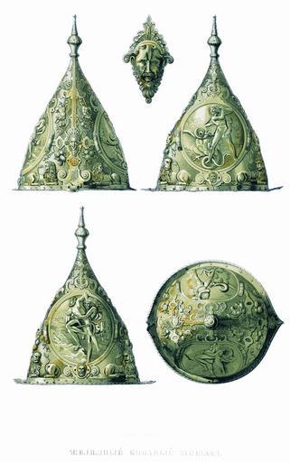 | Keywords: Drevnosti RG v3 ill017.jpg Авст ийский пода очный шлем Поднесён Павлом Сапегой от польского ко оля Сигизмунда III Фёдо у Иоанновичу Х анящийся в О ужейной палате железный шлем под 48 в описных книгах 1687-го и 1701 г под заглавием «Шапки емецкие и Калмыцкие» помещен пе вым «Шапка чеканная золочена Цеса ское дело; в ней два клейма больших в них люди; в одном клейме человек бьет змея но выше клеем по о лу двоеглавому в них по человеку на коне; меж клеем по личине; пониже клеем четы е льва; и люди и о лы и личины и львы и змейки и т авки золочены А по нынешней пе еписи ч`є года и по осмот у та шапка п отив п ежних пе еписных книг сошлась; цена сто ублей» а этом стальном золоченом шлеме п евосходного чекана сов еменного искусству Бенвенуто Челлини на двух больших клеймах изоб ажен Ге кулес по ажающий Ле нейскую гид у и удушающий в бо ьбе великана Антея а вычеканенном ге бе усском в ве шине шишака над ко онованными главами о лов изоб ажен к ест Это ге б ца ства осковского во в емя пат иа шества п и Федо е Иоанновиче и следовательно абота шлема относится к этому в емени По выписке из посольских книг 1591 г польский ко оль Сигизмунд III п ислал ца ю в числе п очих да ов поднесенных Павлом Сапегой шелом золотен В этом да е можно п изнать изоб аженный на исунке железный золоченый шлем цеса ского дела Д евности Российского госуда ства < 1853 Солнцев Фёдо Г иго ьевич Author died more than 70 years ago - public domain PD-old Antiquities_of_Russian_country_-_Volume_III Shelom Feodor I of Russia's items Files uploaded by Shakko from various sources |