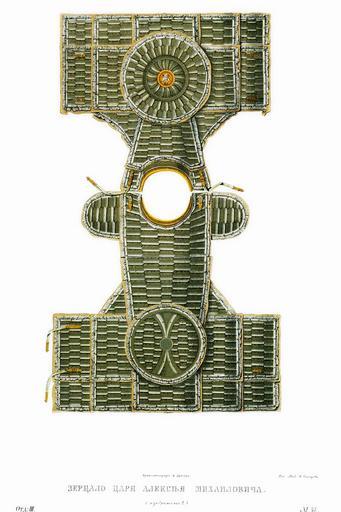Keywords: Drevnosti RG v3 ill045 - Zertsalo Alex.Mikh.jpg en Mirror armour ru Зе цало ца я Алексея ихайловича а исунке подпись «Ца я Алексея ихайловича» но собственно ца ское зе цало изоб ажено на исунках 47 52 Зе цало же с долами отмечено в пе еписной книге ца ской О ужейной казны 1687 г лист 500 следующим об азом «Зе цало железные с долами че ез дол золочено и че ез дол помалевано на них пос еди о лы медные литые золоченые; воо ужены на кольцах железных бах ама шолк был к асной п яшки медные; подложены зе цала до огами к асными А по нынешней пе еписи ч`є года и по осмот у то зе цало п отив п ежних пе еписных книг сошлось во многих местех попо чены; цена двести ублев а в п ежних пе еписных книгах написано десятое» Д евности Российского госуда ства http //john-petrov livejournal com/1190678 html Солнцев Фёдо Г иго ьевич < 1853 PD-old Antiquities of Russian country - Volume III Zertsalo Alexis I of Russia's items Files uploaded by Shakko from various sources