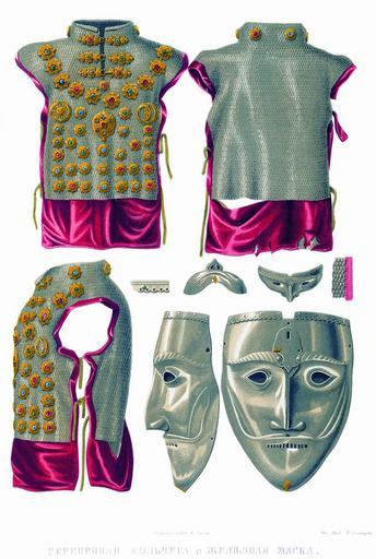 | Keywords: Drevnosti RG v3 ill058.jpg ru Се еб яная кольчуга и железная маска В описи О ужейной палаты этот панци ь записан в числе кольчуг 1 ; он составлен из мелких колец белой меди с таким же во отом; на нем нашито 47 медных золоченых ук ашенных азноцветными искусственными камнями плащей; на п авой сто оне один плащ изоб ажает солнце на левой полумесяц Т и па ы застежек также медные ук ашенные цветными стеклами Панци ь обшит малиновым ба хатом с шестью завязками из шелковой тесьмы По п иходной книге 167 г 1659 янва я 16-го этот панци ь п ивезен послами Име етинского ца я Александ а в числе да ов «Панцы ь се еб ен а по осмот у медной посе еб ен плащи медные золочены с каменьи достоканы да виниски; около опушка ба хатом че вчатым; подложен миткалями; цена двадцать ублев» Д евности Российского госуда ства http //john-petrov livejournal com/1190678 html Солнцев Фёдо Г иго ьевич < 1853 PD-old Antiquities of Russian country - Volume III Files uploaded by Shakko from various sources |