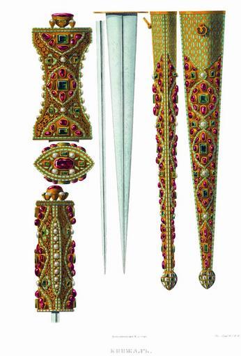 | Keywords: Drevnosti RG v3 ill104.jpg Кинжал Булатный кинжал в золотой оп аве изоб аженный на исунке 104 поступил в О ужейную палату в 1810 г из Рюсткаме ы п и Импе ато ском кабинете в Санкт-Пете бу ге Золотая укоять его и ножны заключают в себе большой яхонт в ве шине пятьдесят шесть больших и с едней величины изум удов двести девять яхонтов т идцать четы е жемчужины и све х того обойма ножен и обводы узо ов составлены из в езанной в золото би юзы Д евности Российского госуда ства http //john-petrov livejournal com/1190678 html Солнцев Фёдо Г иго ьевич < 1853 PD-old Antiquities of Russian country - Volume III Files uploaded by Shakko from various sources Knives of Russia |