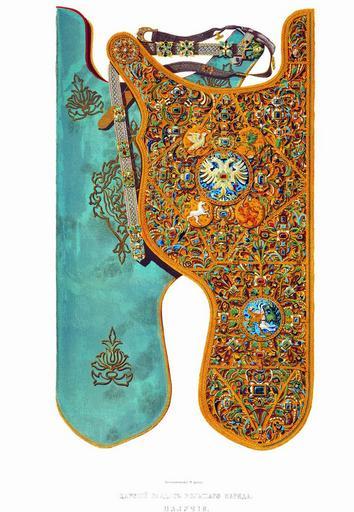 Keywords: Drevnosti RG v3 ill123.jpg ru Ца ский саадак большого на яда алучие Под обное описание этого великолепного золотого ук ашенного финифтью и д агоценными камнями саадака помещено во вто ой статье описи ца ской О ужейной казны 1687 г с п ежних описных книг в кото ых он вносился пе вым «Саадак большаго на яду оп ава золотая чеканная на п о ез на подзо е с финифты озными; подзо се еб ян золочен; около налучи кайма канительная золотая; налучье бендь да два плаща больших да четы е плаща меньших с финифты; в бенди в золоте в гнездах в езывано каменье алмазы в с едине алмаз большой г анен около ево восемь алмазов поменьши да около бенди т идцать один алмазец малых да в с еднем в большом плаще в золотом о ел двоеглавой с ко уною в се едине в гнездех в золоте камень лал около плаща двадцать четы е яхонта че вчетых да двадцать четы е изум удов; на д угом плаще чеканен человек на коне копьем колет змию; около плаща каменьи в золоте двадцать шесть яхонтов че вчетых да двадцать шесть изум удов да на меньших плащах в пе вом плаще о ел одноглавой с ко уною на д угом плаще г ив в п авом похте де жит яблоко со к естом в т етьем плаще зве ь ин ог в пе едних ногах де жит скипет в четве том плаще лев в пе едних ногах де жит меч; да на налуче ж в оп аве в золото в езывано каменье в гнездах т идцать т и алмаза осьм-надцать яхонтов больших лазо евых осьмнадцать яхонтов че вчетых четы е лалы четы надцать изум удов больших шестнадцать изум удов малых; назади лубья хоз е инной шит волоченым золотом; на колчане две бенди да два плаща в золоте в езывано каменье в гнездех золотых в двух бендях в се единах два алмаза больших г аненых около их по осьми алмазов г аненых же поменьши да около большой бенди т идцать один алмаз г аненые ж да около меньшой бенди т идцать пять алмазов г аненые ж; в большом плаще в се едине о ел двоеглавой с ко уною в о ле в гнезде в золотом яхонт че вчет около плаща девятнадцать яхонтов че вчетых девятнадцать изум удов да в меньшом в нижнем плаще ин ог около плаща четы надцать яхонтов че вчатых четы надцать изум удов да на колчане ж в гнездех золотых шестнадцать алмазов т инадцать яхонтов лазо евых больших да семнадцать яхонтов че вчетых пять изум удов больших двенадцать изум удов поменьши; в исподи колчана в гнездех золотых два алмаза г аненых на с едине яхонт лазо ев большой два яхонта се едних г аненых лазо евых шесть яхонтов че вчатых г аненых пять изум удов; пояс тесьма золото с се еб ом шолки озные на поясу оп ава золотая вольяшная с финифты озными во штинадцати местех а в оп аве в езывано в гнездех золотых каменье осьмнадцать алмазов г аненых двадцать четы е яхонта че вчетых осьмнадцать изум удов А по п ежней ч` года 1682 и понынешней ч`є года 1687 пе еписи и по осмот у на том саадаке на налуче яхонта че вчетова да двух изум удов да в колчане в плаще изум удца ж нет да в поясу в оп аве двух яхонтов че вчетых пяти изум удов всего десяти каменьев нет и с п ежними пе еписными книгами тот саадак сшолся; цена тому саадаку каменью и золоту и делу две тысячи девять сот пять ублев а по п ежним книгам ч` года тот саадак написан пе вым» Обозначение цены за каменья за золото и за дело т е за аботу может служить доказательством что саадак делан в московской асте ской палате; особенно п и сходстве финифтяных ук ашений с шапкой пе вого на яда ца я ихаила Федо овича «что делана в П иказе у золотаг