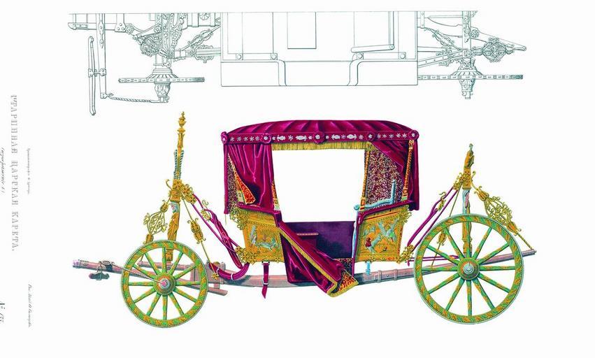 | Keywords: Drevnosti RG v3 ill133.jpg ru Ста инная ца ская ка ета изоб ажение 1 Ка ета или ве нее колымага изоб аженная на исунках 133 и 134 в описи О ужейной палаты означенная под 31 «Английская»; по описной книге 1706 г «п ивезена из Английской земли в л`г году 1625 пе еделана на оскве в п`s году 1678 » Пе вый экипаж под названием ка еты carriage был п ислан ца ю Бо ису Годунову от английской ко олевы Елизаветы Х анящаяся в О ужейной палате описываемая здесь ка ета соответствует более этой эпохе нежели 1625 г в кото ом по посольским книгам о п исылке ка еты не упоминается а задней части д ог изоб ажен оссийский ге б без московского ге ба как он изоб- ажался еще п и ца е Бо исе осковский ге б ниже отдельно а задней части ка еты вы езано ельефом с ажение с ту ками; витязь в золотой б оне и шлеме наезжает с копьем на султана Спе еди ка еты тот же витязь в ко оне на колеснице то жественно шествует с победы Пе ед ним несут знамя с изоб ажением двуглавого о ла кото ого одна половина к асная д угая белая Без сомнения этот ца ственный витязь п едставляет Бо иса Годунова кото ого посольство к Елизавете имело целью мысль его о новом союзе всех х истианских де жав для изгнания ту ок из Ев опы П и частой пе еписи описей ошибка легко могла вк асться в обозначение года буквами а `iс буквой i` под титлом 1603 п инято за л `г 1625 В описи конюшенной казны 1706 г описание ка еты следующее «Ко ета большая Аглинская ба хатная че вчатая с плащами се еб еными; в ней два к еста се еб яных золоченых с мощьми; на ко ете по кайме к угом всей ко еты п ибито двенадцать плащей се еб яных больших сквозных; в плащах чеканены о лы двоеглавые с ко унами да птицы в т авах се еб еные белые п ишиваны п оволокою се еб еные; наве ху у каймы к угом всей ко еты к уживо золотое по к уживу п ибивано гвоздье се еб еное белое большое счетом сто т инадцать гвоздей двух гвоздей нет; на п авой сто оне два плаща испо чены и се еб о выломлено а левой сто оне испо чен плащ да задней плащ попо чен же п ишит п оволокою медною; кайма подложена ба хатом че вчетым виницейским; в ко ете ве х и пе едние и задние стены и подводные полы и столбцы и ящики обито и одве ье и отметные полы подложены ба хатом че вчатым и т авчатым по золотной земле; по ба хоту све ху п ибиван голун се еб яной с гвоздьми маленькими золочеными медными; ве х на осьми столпцах де евянных на столпцах све ху и внизу зве и и птицы езные писаны золотом и к асками; на столбцах по ба хату п ибиван голун се еб яной с гвоздьми се еб яными белыми счетом на столбцах сто пятьдесят восемь гвоздей; в ко ете ж к угом ве ху подзо се еб яной чеканной сквозной чеканены птицы в т авах с плащиками п ибиваны гвоздьми медными золочеными; под каймою п ибито к угом всей ко еты бах ама золотая длинная; вве ху в ко ете в с едине о ел двоеглавой шит золотом да се еб ом волоченым местами низан жемчугом к угом бах ама золотная; к угом ко еты подводные полы ба хатные че вчатые гладкие и обламы обшиты тем же ба хатом; на обламах к угом ко еты и к угом столпцев п ибита бах ама золотная; повыше п ибит голун се еб еной с гвоздьми се еб еными счетом к угом всей ко еты двести восемьдесят пять гвоздей; на полах завязки тканые се еб ом с золотом на них наконешники се еб еные; одве ье с лица обшито ба хотом че вчатым на одве ьях отметные полы того ж ба хоту; на задней стене по ба хоту п ишито девять плащей се еб еных к угом пол по к аем обшито голуном се