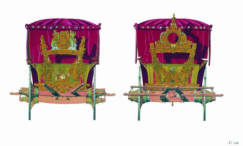 | Keywords: Drevnosti RG v3 ill134.jpg ru Ста инная ца ская ка ета изоб ажение 1 Ка ета или ве нее колымага изоб аженная на исунках 133 и 134 в описи О ужейной палаты означенная под 31 «Английская»; по описной книге 1706 г «п ивезена из Английской земли в л`г году 1625 пе еделана на оскве в п`s году 1678 » Пе вый экипаж под названием ка еты carriage был п ислан ца ю Бо ису Годунову от английской ко олевы Елизаветы Х анящаяся в О ужейной палате описываемая здесь ка ета соответствует более этой эпохе нежели 1625 г в кото ом по посольским книгам о п исылке ка еты не упоминается а задней части д ог изоб ажен оссийский ге б без московского ге ба как он изоб- ажался еще п и ца е Бо исе осковский ге б ниже отдельно а задней части ка еты вы езано ельефом с ажение с ту ками; витязь в золотой б оне и шлеме наезжает с копьем на султана Спе еди ка еты тот же витязь в ко оне на колеснице то жественно шествует с победы Пе ед ним несут знамя с изоб ажением двуглавого о ла кото ого одна половина к асная д угая белая Без сомнения этот ца ственный витязь п едставляет Бо иса Годунова кото ого посольство к Елизавете имело целью мысль его о новом союзе всех х истианских де жав для изгнания ту ок из Ев опы П и частой пе еписи описей ошибка легко могла вк асться в обозначение года буквами а `iс буквой i` под титлом 1603 п инято за л `г 1625 В описи конюшенной казны 1706 г описание ка еты следующее «Ко ета большая Аглинская ба хатная че вчатая с плащами се еб еными; в ней два к еста се еб яных золоченых с мощьми; на ко ете по кайме к угом всей ко еты п ибито двенадцать плащей се еб яных больших сквозных; в плащах чеканены о лы двоеглавые с ко унами да птицы в т авах се еб еные белые п ишиваны п оволокою се еб еные; наве ху у каймы к угом всей ко еты к уживо золотое по к уживу п ибивано гвоздье се еб еное белое большое счетом сто т инадцать гвоздей двух гвоздей нет; на п авой сто оне два плаща испо чены и се еб о выломлено а левой сто оне испо чен плащ да задней плащ попо чен же п ишит п оволокою медною; кайма подложена ба хатом че вчетым виницейским; в ко ете ве х и пе едние и задние стены и подводные полы и столбцы и ящики обито и одве ье и отметные полы подложены ба хатом че вчатым и т авчатым по золотной земле; по ба хоту све ху п ибиван голун се еб яной с гвоздьми маленькими золочеными медными; ве х на осьми столпцах де евянных на столпцах све ху и внизу зве и и птицы езные писаны золотом и к асками; на столбцах по ба хату п ибиван голун се еб яной с гвоздьми се еб яными белыми счетом на столбцах сто пятьдесят восемь гвоздей; в ко ете ж к угом ве ху подзо се еб яной чеканной сквозной чеканены птицы в т авах с плащиками п ибиваны гвоздьми медными золочеными; под каймою п ибито к угом всей ко еты бах ама золотая длинная; вве ху в ко ете в с едине о ел двоеглавой шит золотом да се еб ом волоченым местами низан жемчугом к угом бах ама золотная; к угом ко еты подводные полы ба хатные че вчатые гладкие и обламы обшиты тем же ба хатом; на обламах к угом ко еты и к угом столпцев п ибита бах ама золотная; повыше п ибит голун се еб еной с гвоздьми се еб еными счетом к угом всей ко еты двести восемьдесят пять гвоздей; на полах завязки тканые се еб ом с золотом на них наконешники се еб еные; одве ье с лица обшито ба хотом че вчатым на одве ьях отметные полы того ж ба хоту; на задней стене по ба хоту п ишито девять плащей се еб еных к угом пол по к аем обшито голуном се