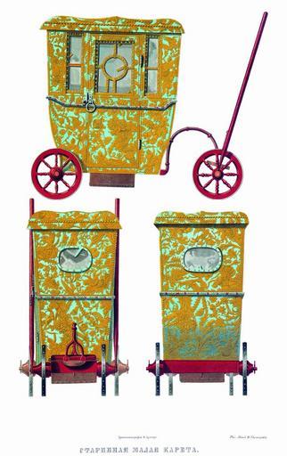 Keywords: Drevnosti RG v3 ill135.jpg ru Ста инная малая ка ета Х анящиеся в О ужейной палате изоб аженные на исунках два маленьких возка один на колесах д угой на полозьях по пе еписным книгам назывались потешными для катания ца ских детей По п еданию эти два возка п инадлежали ца евичу Пет у Алексеевичу По описи 1706 г они в конюшенной казне не состояли но были ве оятно в комнатах как нап име упоминается о потешном возке внесенном в комнаты п и ца е Иоанне Алексеевиче «Возок маленькой слюденой потешной ве х на нем писаны о лы и люди на конях и пешие и птицы; две и на обе сто оны оство ные; в нем обито кожею золоченою с т авы; двух окончин нет и в нем п оломлено наве ху четы е маковицы сломлены; око чье обшито сукном к асным полозье к ашены су иком По пе еписи с` года 200 т е 1692 того возка нет а по сказке казначея Федо а Селиве стова До офея икулина тот де возок внесен в ве х в комнату Великому Госуда ю Ца ю и Великому Князю Иоанну Алексеевичу всея Великия и алыя и Белыя Росии Самоде жцу А по нынешней пе еписи j`з года 707 того возка в казне не явилось же» В описи 1706 г упоминается также о возке на колесах ца евича Алексея Пет овича лист 456 «Возок постельной новой на большой конюшне Великаго Госуда я Ца евича и Великаго Князя всея Великия и алыя и Белыя Росии Алексея Пет овича; назади и напе еди того возка о лы писаны золотом по голубой земле; по сто онь по два куба с т авами; ве х обит кожею че вчатою а по коже писаны т авы озными к асками; гвоздьми обит медными пупчатыми а каймы гвоздьми мелкими; стан и колеса к ашены су иком а в нем подбито вве ху стамедом алым с голуном шолковым лазо евым гвоздьми медными а сто оны и две и обиты кожею че вчатою А в нынешней пе еписи j`з года 707 казначей Федо Селиве стов сказал Тот де возок и по ныне на большой же конюшне » Д евности Российского госуда ства http //john-petrov livejournal com/1190678 html Солнцев Фёдо Г иго ьевич < 1853 PD-old Antiquities of Russian country - Volume III Files uploaded by Shakko from various sources Carriages in Russia