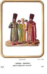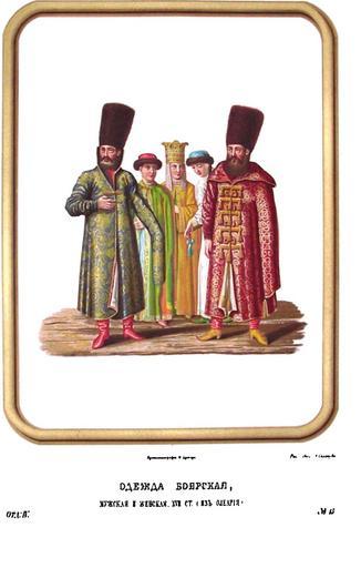 | Keywords: Drevnosti RG v4 ill015.jpg ru Д евности Российского госуда ства Antiquities of Russian country 1846 1853 Том 4 Иллюст ато ru Солнцев Фёдо Г иго ьевич Одежда боя ская мужская и женская XVII в из «Путешествия» Олеа ия П едставляя здесь изоб ажения одежды усских людей заимствованные из «Путешествия» Олеа ия п исоединим для объяснения и описание его «Русские мужчины вообще ослы толсты и сильны цветом лица подобны д угим Ев опейцам У них в большой чести ши окие бо оды и толстые животы Его Ца ское Величество упот ебляет таковых для услуг п и то жественных п иемах послов желая этим п идать более то жественности Усы у Русских также длинные пок ывают губы Длинные волосы висящие до плеч носят одни только священники а у п очих они подст ижены Вельможи даже ст игут волосы считая это ук ашением Как ско о кто впадет в немилость у Ца я то отпускает длинные волосы и не п ичесывая их носит во все в емя опалы Ца ской Этот обычай может быть пе еняли они от Г еков кото ым во всем хотят под ажать ибо Г еки по описанию Плута ха ходили с длинными спущенными волосами во в емя смутных обстоятельств Женщины в подобных случаях волосы свои ост игали Русские женщины оста с едняго хо ошаго сложения; они имеют нежный цвет тела но в го одах все они умянятся и белятся и так г убо и заметно что кажется будто по лицу их п овел кто-нибудь го стью муки и вымазал их щеки кистью; б ови и есницы ок ашивают они в че ный или ко ичневый цвет Они дозволяют себе напоминать соседкам и знакомым о соблюдении этого обычая хотя бы к асота их п и одная п евосходила искусственную как будто боясь чтоб пе вая не затмила вто ой Так жена боя ина Князя Ивана Бо исовича Че касскаго женщина отличной к асоты не хотевшая сначала умяниться и белиться была уп екаема в на ушении обычая п едков и доведена до необходимости упот еблять умяны т е «зажечь свечу п и солнечном свете» Так как обычай этот п инят всеми и соблюдается явно то жених во в емя сватовства между п очими пода ками должен п инести невесте ко обочку умян Замужние женщины подби ая волосы на голове п ик ывают их шапкою; девицы же сплетают и опускают на спину косою в оконечность коей вплетают к асную шелковую ленточку У детей ниже десяти лет как у мальчиков так и у девочек волосы ст игут оставляя несколько локонов по обеим сто онам; девочкам в уши вдевают большие се ьги Одежда мужчин такая же как у Г еков; убашки у них ши окие ко откие едва достигают до колен; во отник гладкий без сбо ок; спинка подшита в виде т еугольника спускается с плеч и шита к асным шелком; у многих подоплека подшита к асною тафтою к немалому ук ашению У богатых людей вышивают во отник низ убашки и укава азными шелками и иногда золотом и жемчугом; во отник застегивается у таковых или двумя большими жемчужинами или золотыми и се еб яными пуговицами ижнее платье носят очень ши окое све ху где п отянут шну по п оизволу аспускающий и стягивающий его Пове х убашки и штанов они носят узкие кафтаны длиною до колен с длиннейшими укавами надеваемыми на уки в сбо ках; во отник у кафтана ши окий длиною в четве ть локтя подшит ба хатом или у вельмож золотною мате ией; его выставляют из-за д угаго кафтана оставляя незастегнутым Све х кафтана носят д угое одеяние длиною до ик оно называется фе езью; как кафтан так и фе езь делается из нанки киндяка тафты или атласа смот я по состоянию каждаго Фе езь подбивается хлопчатою бум