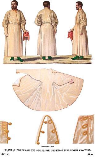 Keywords: Drevnosti RG v4 ill017.jpg ru Д евности Российского госуда ства Antiquities of Russian country 1846 1853 Том 4 Иллюст ато ru Солнцев Фёдо Г иго ьевич Одежда боя ская XVII в Ут енний шелковый кафтан Хотя в надписи одежда сия и названа ут енним летним кафтаном но ве оятнее она п инадлежит к фе езям коих мы коснулись анее Фе езь была мужской и женской одеждой; сходная с ней у г еков вст ечается «исподнее платье» по пе еводу Гнедича « иза»; по Рейфу «фе ез» п оисходит от ту ецкого «плащ» В ста ину у усских на ядные са афаны назывались фе езями кои были теплые и холодные Пок ой и ме у фе ези так описывает нам К оильная книга с 7139-го по 7146 г «Ск оены Госуда ю фе ези тафта ала виницейска взята с Казеннаго дво а длина фе езем два а шина ши ина в плечех а шин с ве шком в подоле ши ина т и а шина два ве шка укава длина полто а а шина в ко ени восемь ве шков в запястье ши ина т и ве шка» Из этого видно что фе езь азнилась от кафтана станом и укавами кои у ней были бо истые в ко ени ши е а к запястью уже Фе ези теплые и холодные заменяли кафтаны кои как известно из К оильных книг бывали становые ездовые ве хние и нижние дождевые с нашивками то очковыми шелковыми с золотом Они ук ашались завязками с кистьми и об азцами или к угами кои низаны были по ба хату жемчугом и до огими каменьями К ним п истегивались аламы или во отники стоячие и лежачие Опись домашнему имуществу ца я Иоанна IV показывает что фе ези покупались у тата шиты были из камки бу ской и кизылбашской т е пе сидской пе еделывались не едко из платна авно и кафтаны с укавами из фе езей Указом 19 фев аля 1680 г повелено «в Господские и в Владычни п аздники и в п азднества на очитых Святых и Госуда евых выходов боя ам окольничим думным и ближним людем стольникам ст япчим дво янам осковским быть в золотных и в ба хатных и в объя инных фе езях» Фе езь иногда надевалась све х доспеха; укава у нее были п о езные и длиннее чем у зипуна и кафтана В К оильной книге они показаны длиной 1 1/2 а шина а сама фе езь длиной 2 а шина ши иной в плечах 1 а шин 1 ве шок в подоле ши иной 3 а шина 2 ве шка 1846 1853 http //www runiverse ru/ Солнцев Фёдо Г иго ьевич PD-Art Antiquities of Russian country - Volume IV Russian boyars Files uploaded by Shakko from various sources Uploaded with UploadWizard Feryaz