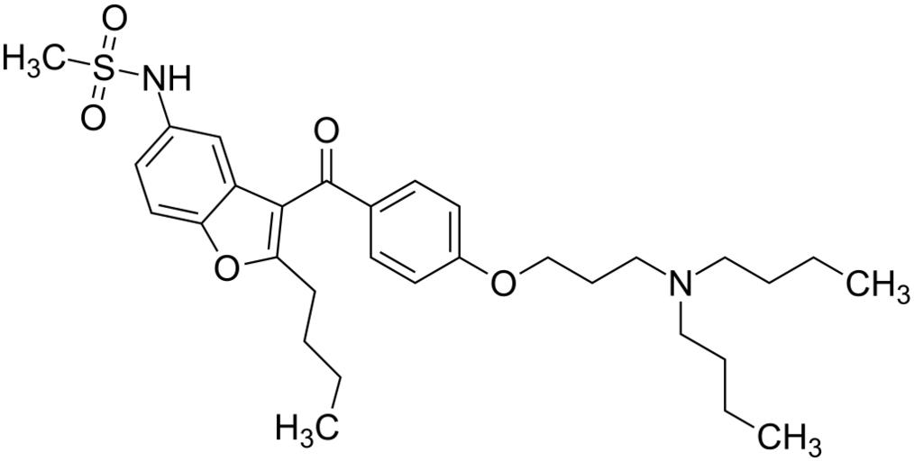 Keywords: Dronedarone 200.svg validSVG Structure of N- 2-butyl-3- 4- 3- dibutylamino propoxy benzoyl benzofuran-5-yl methanesulfonamide Own 2014-04-16 Emeldir <span class signature-talk >talk</span> Chemical structure verified https //upload wikimedia org/wikipedia/commons/b/bd/Dronedarone_200 svg 1S/C31H44N2O5S/c1-5-8-12-29-30 27-23-25 32-39 4 35 36 15-18-28 27 38-29 31 34 24-13-16-26 17-14-24 37-22-11-21-33 19-9-6-2 20-10-7-3/h13-18 23 32H 5-12 19-22H2 1-4H3 ZQTNQVWKHCQYLQ-UHFFFAOYSA-N 141626-36-0 Synonyms <small>N- 2-Butyl-3- p-3- dibutylamino propoxybenzoyl -5-benzofuranyl methanesulfonamide Drondarone Dronedarone Methanesulfonamide N-3- dibutylamino propoxybenzoyl-5-benzofuranyl- Multaq N- dibutylamino propoxybenzoyl-5-benzofuranylmethanesulfonamide SR 33589 SR 33589B SR-33589</small> PD-chem Dronedarone |