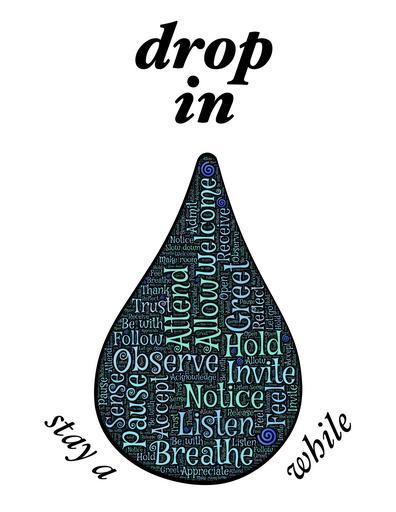 Keywords: droplet drop in attend drop stay a while presence pausing breathing sensing being observing noticing awareness meditation peace compassion listening attending
