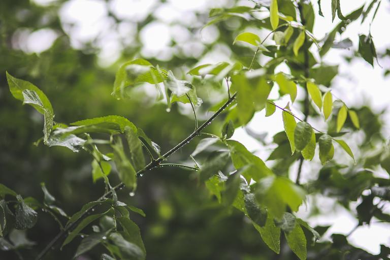 Keywords: drops rain branch green leaves leaf rainy day