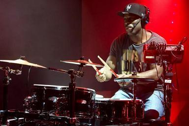 Keywords: drummer musician concert band music performance entertainment drumsticks man shadow profile drums cymbals