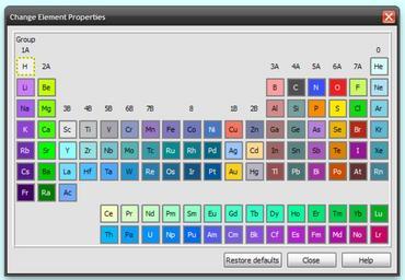 Keywords: DS Visualizer preferred settings colours.png s Colour code 505050 Carbon C black<br> F0F0F0 Hydrogen H white<br> F51E1E Oxygen O red<br> 3C50FA Nitrogen N blue<br> D8FCF8 Helium He cyan<br> CD7EFF Lithium Li lilac<br> C5FF00 Beryllium Be yellow-green<br> FAA0A0 Boron B pink<br> C8FA64 Fluorine F yellow-green<br> AFE3F4 Neon Ne cyan<br> AA5EF2 Sodium Na lilac<br> 89FF00 Magnesium Mg green<br> D28C8C Aluminium Al pink-brown<br> 78A0A0 Silicon Si blue-grey<br> FA8C00 Phosphorus P orange<br> FAEB00 Sulfur S yellow<br> 12DC12 Chlorine Cl green<br> 81D1E4 Argon Ar sky blue<br> 8F41D3 Potassium K purple<br> 3DFF00 Calcium Ca green<br> E6E6E4 Scandium Sc grey<br> C0C3C6 Titanium Ti grey<br> A7A5AC Vanadium V grey<br> 8898C0 Chromium Cr grey-blue<br> 9878C0 Manganese Mn grey-blue<br> 8078C0 Iron Fe grey-purple<br> 7078C0 Cobalt Co grey-blue<br> 4876C2 Nickel Ni grey-blue<br> F67561 Copper Cu pink-orange<br> 747FA9 Zinc Zn blue-grey<br> AA7878 Gallium Ga pink-brown<br> 699191 Germanium Ge blue-grey<br> B482DC Arsenic As lilac<br> EBB400 Selenium Se yellow-brown<br> B42814 Bromine Br red-brown<br> 5DBAD1 Krypton Kr teal<br> 712EB2 Rubidium Rb green<br> 00FF00 Strontium Sr green<br> 96FDFF Yttrium Y cyan<br> 96E1E1 Zirconium Zr light blue<br> 74C3CB Niobium Nb light blue<br> 50B4B0 Molybdenum Mo teal<br> 389CA8 Technetium Tc teal<br> 018C90 Ruthenium Ru dark teal<br> 0B7C8C Rhodium Rh dark teal<br> 006881 Palladium Pd teal<br> 99C6FF Silver Ag silvery blue<br> FFD891 Cadmium Cd peach<br> A06464 Indium In brown<br> 5A8282 Tin Sn blue-grey<br> AA5ABE Antimony Sb lilac<br> DC8200 Tellurium Te brown<br> 961496 Iodine I purple<br> 429FB0 Xenon Xe teal<br> 57198F Caesium Cs purple<br> 00CB00 Barium Ba green<br> 70DEFF Lanthanum La light blue<br> F7FCCA Cerium Ce cream<br> D9FFC8 Praseodymium Pr light green<br> C6FFC8 Neodymium Nd light green<br> A4FFC8 Promethium Pm light green<br> 92FFC8 Samarium Sm light green<br> 63FFC8 Europium Eu aqua<br> 47FFC8 Gadolinium Gd aqua<br> 32FFC8 Terbium Tb aqua <br> 1FFFB7 Dysprosium Dy aqua<br> 00FF9D Holmium Ho aqua<br> 00E776 Erbium Er green<br> 00D353 Thulium Tm green<br> 00C039 Ytterbium Yb green<br> 00AD23 Lutetium Lu green<br> 4DC2FF Hafnium Hf blue<br> 4DA7FF Tantalum Ta blue<br> 2094D0 Tungsten W blue<br> 277EAC Rhenium Re blue<br> 206890 Osmium Os dark blue<br> 185480 Iridium Ir dark blue<br> 005791 Platinum Pt dark blue<br> F8D020 Gold Au gold<br> B5B5C3 Mercury Hg grey<br> 965050 Thallium Tl brown<br> 4B7373 Lead Pb blue-grey<br> A032A0 Bismuth Bi purple<br> C85000 Polonium Po brown<br> 643232 Astatine At dark brown<br> 428497 Radon Rn teal<br> 420066 Francium Fr dark purple<br> 007C00 Radium Ra dark green<br> 71AAFC Actinium Ac blue<br> 00BBFF Thorium Th blue<br> 00A1FF Protactinium Pa blue<br> 0092FF Uranium U blue<br> 0081F2 Neptunium Np blue<br> 006BF2 Plutonium Pu blue<br> 555BF2 Americium Am violet<br> 785BE3 Curium Cm violet<br> 894FE3 Berkelium Bk purple<br> A137D5 Californium Cf purple<br> B31FD5 Einsteinium Es purple<br> B31FBA Fermium Fm pinkish purple <br> B30DA7 Mendelevium Md pinkish purple<br> BD0D87 Nobelium No pink<br> C90066 Lawrencium Lr pink<br> 2015-03-02 own DS Visualizer Jynto talk 'Annotated' version cc-zero Images by Jynto Screenshots_of_free_software Screenshots_of_Windows_software Periodic table |