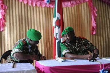 Keywords: AMISOM's Force Commander, General Silas Ntigurirwa, speaks with AMISOM'S outgoing contingent comander, Colonel Habarubira Jean Luc, today at a ceremony to mark the rotation of 78 of his troops back home to Burundi. AMISOM Photo AMISOM's Force Commander, General Silas Ntigurirwa, speaks with AMISOM'S outgoing contingent comander, Colonel Habarubira Jean Luc, today at a ceremony to mark the rotation of 78 of his troops back home to Burundi. AMISOM Photo |
