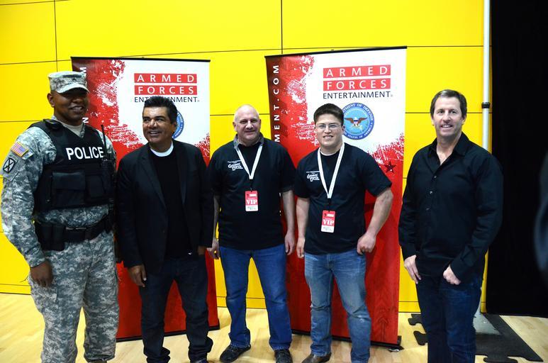 Keywords: people ANSBACH, Germany (May 20, 2015) -- Comedians George Lopez and Bryan Kellen visited U.S. Army Garrison Ansbach for a stand-up comedy show Tuesday at the Katterbach Fitness Center. The show, presented by Armed Forces Entertainment and titled “George Lopez: Grunt by Association,” played to an audience of approximately 1,500 USAG Ansbach community members. Before the show, Lopez and Kellen toured a hangar and the flightline of Katterbach Army Airfield with Soldiers of the 12th Combat Aviation Brigade. After the show, Lopez and Kellen stayed to take photos with fans of the show. (U.S. Army photo by Stephen Baack, USAG Ansbach Public Affairs) ANSBACH, Germany (May 20, 2015) -- Comedians George Lopez and Bryan Kellen visited U.S. Army Garrison Ansbach for a stand-up comedy show Tuesday at the Katterbach Fitness Center. The show, presented by Armed Forces Entertainment and titled “George Lopez: Grunt by Association,” played to an audience of approximately 1,500 USAG Ansbach community members. Before the show, Lopez and Kellen toured a hangar and the flightline of Katterbach Army Airfield with Soldiers of the 12th Combat Aviation Brigade. After the show, Lopez and Kellen stayed to take photos with fans of the show. (U.S. Army photo by Stephen Baack, USAG Ansbach Public Affairs) |