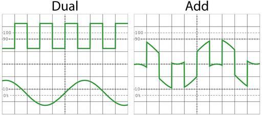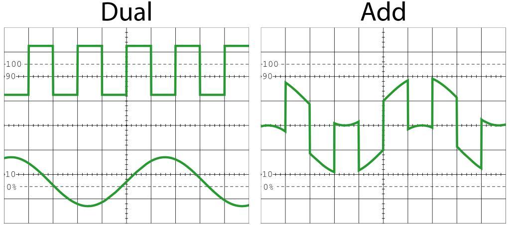 Keywords: Dual-Add Mode.svg A Diagram of an Oscilloscope in both DUAL and ADD modes with a Square Wave on one channel and a Sinusoidal Wave on the other own 2006-05-28 jjbeard PD Oscillograms