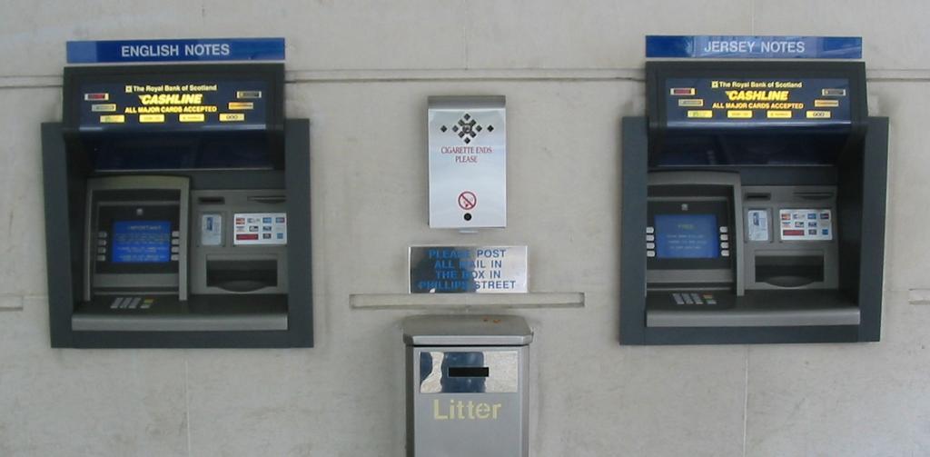 | Keywords: Dual currency cash machines in Jersey.jpg Automatic teller machines at a bank in Jersey dispensing dual currencies Bank of England sterling and Jersey pounds Photo taken by Man vyi with Canon PowerShot A40 on 29/6/2005 2005-06-29 own assumed Man vyi Automatic teller machines Coins on display and in popular culture Pound Pound Sterling Money of Jersey |