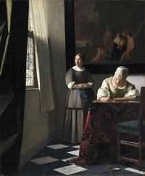 Keywords: DublinVermeer.jpg Artwork Q641666 LangSwitch Lady writing a letter with her maid <ref>http //www essentialvermeer com/catalogue/lady_writing_a_letter html Essential Vermeer </ref> Schrijvende vrouw met dienstbode <ref>http //www essentialvermeer com/catalogue/lady_writing_a_letter html Essential Vermeer </ref> Alternate titles A woman writing a letter with her maidservant <ref>http //www nationalgallery ie/html/paintings html National Gallery of Ireland </ref> oil canvas cm 71 1 58 4 78000 National Gallery of Ireland IVMeer signature center right ~ Object history by 1676-01-27 Catharina Bolnes ca 1631-1688 <br /> ProvenanceEvent 1676 acquisition Hendrick van Buyten 1632-1701 Delft by 1710 Josua van Belle 1 1630/1636 -1710 Rotterdam <br /> ProvenanceEvent 1710 inheritance Ida Catharina van der Meyden 1729 Rotterdam ProvenanceEvent 1729 inheritance Josua van Belle 2 1680-1738 ProvenanceEvent 1730-09-06 sale Josua van Belle 2 Rotterdam by 1734 Franco van Bleyswijck 1734 Delft <br /> ProvenanceEvent 1734 inheritance Catharina van der Burch 1707-1761 The Hague ProvenanceEvent 1761 inheritance LangSwitch the estate of de erven Hendrick van Slingelandt < 1881 Viktor von Miller zu Aichholz 1845-1910 Vienna <br /> purchase Charles Sedelmeyer Paris Viktor von Miller zu Aichholz Vienna ProvenanceEvent 1881 purchase E Secrétan Paris Charles Sedelmeyer Paris ProvenanceEvent 1889-07-01 sale Boussod Valadon Co E Secrétan Galerie Charles Sedelmeyer Paris Marinoni Paris <br />Kleinberger Paris <br /> - ca 1895 1906 Alfred Beit 1853-1906 London <br /> ProvenanceEvent 1906 inheritance Sir Otto Beit 1865-1930 London ProvenanceEvent 1930 inheritance Sir Alfred Beit 1903-1994 London /Russborough House County Wicklow Ireland ProvenanceEvent 1987 gift National Gallery of Ireland Dublin Sir Alfred Beit Russborough House County Wicklow Ireland source ~ 1670-1671 Creator Johannes Vermeer Other versions youtjbfksdbg mzvmcbvhshgbarbguyfvkjbzcgsr gbsugbsfdbgg your mom PD-old-100 LangSwitch References Noten <references /> Lady writing a letter with her maid Vermeer Secretan sale 1 July 1889 Taken with Hasselblad Imacon Ixpress CF 528-22 |