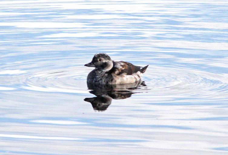 | Keywords: outdoor When first posted I had thought that this bird was an adult male. Doing more research, I now feel that it was a HY male in "supplemental 1" plumage or there-about. Primary reason being the amount of brown in the face and flanks and breast. I think that in an adult male in molt that the mix would be black and white, not brown and white. And although the bill of an adult male might be all gray at this time of year, I think that this is more likely of an imm bird. The following is copied from NA Birds: "Alternate I Plumage Prealternate I molt begins in Oct and continues to mid-Dec. Timing known only for male, assumed to be similar for female (Palmer 1976). Partial molt; Juvenal wing and Basic I tail and belly retained. Male. A less well-defined version of Definitive Alternate male plumage. Gray patch around eye more brown and less well defined, loral-patch dark brown (not black). Breast has smaller and less crisp black band than in Definitive Alternate. Back a mixture of black and white feathers; scapulars gray to white. Sides and flanks light gray, belly white." Robertson, Gregory J. and Jean-Pierre L. Savard. 2002. Long-tailed Duck (Clangula hyemalis), The Birds of North America Online (A. Poole, Ed.). Ithaca: Cornell Lab of Ornithology; Retrieved from the Birds of North America Online: bna.birds.cornell.edu/bna/species/651 doi:10.2173/bna.651 When first posted I had thought that this bird was an adult male. Doing more research, I now feel that it was a HY male in "supplemental 1" plumage or there-about. Primary reason being the amount of brown in the face and flanks and breast. I think that in an adult male in molt that the mix would be black and white, not brown and white. And although the bill of an adult male might be all gray at this time of year, I think that this is more likely of an imm bird. The following is copied from NA Birds: "Alternate I Plumage Prealternate I molt begins in Oct and continues to mid-Dec. Timing known only for male, assumed to be similar for female (Palmer 1976). Partial molt; Juvenal wing and Basic I tail and belly retained. Male. A less well-defined version of Definitive Alternate male plumage. Gray patch around eye more brown and less well defined, loral-patch dark brown (not black). Breast has smaller and less crisp black band than in Definitive Alternate. Back a mixture of black and white feathers; scapulars gray to white. Sides and flanks light gray, belly white." Robertson, Gregory J. and Jean-Pierre L. Savard. 2002. Long-tailed Duck (Clangula hyemalis), The Birds of North America Online (A. Poole, Ed.). Ithaca: Cornell Lab of Ornithology; Retrieved from the Birds of North America Online: bna.birds.cornell.edu/bna/species/651 doi:10.2173/bna.651 |
