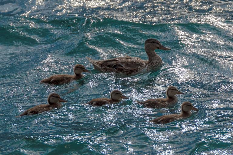 Keywords: ducks back light water water bird waterfowl duck family chicks