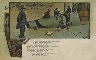Keywords: Duhmstaan Trier.jpg Trierer Domsteins gemalt von K Runge und dem Duhmstaan-Gedicht von Julius Friedrich Bernards Gedicht <poem> Om Duhmstaan sei mehr romgerötscht Et war net emmer ginstig De Box zerröss de Kaap verlohr Dä Kopp zerschonn blutrinstig Kaom eich dann haam dao wosst eich gleich Ei braucht kaan Red'ze haalen Eich braucht blus guden Dag ze soan Dat anneret saoth mein Ahlen Roff de Trepp Schlich eich mich off den Ziewen Doch mein Kleep Die sein net ausgebliewen </poem> Cathedrale of Trier http //www zeno org/Ansichtskarten/M/Trier +Rheinland-Pfalz/Duhmstaan Zeno org - Zenodot Verlagsgesellschaft mbH Kunst- und Verlagsanstalt chaar Dathe Komm -Ges a Akt Trier uploaded by Tomukas Dieses Werk ist nach unserer Meinung frei von Rechten Dritter Vor einer weiteren Verwertung ist unbedingt zu überprüfen ob diese Auffassung haltbar ist da Zenodot jegliche Haftung ablehnt und ausdrücklich nicht von möglichen Ansprüchen Dritter freistellt Für den Fall einer Bestätigung unserer Auffassung gilt Dieser Inhalt darf als Einzelwerk oder Werkbestandteil - auch zu kommerziellen und gewerblichen Zwecken - kopiert verbreitet öffentlich wiedergegeben und Dritten zugänglich gemacht werden Wir bitten darum auf die Herkunft des Inhaltes wie folgt hinzuweisen Quelle http //www zeno org - Zenodot Verlagsgesellschaft mbH Copyright-Vermerke Marken oder andere Rechtsvorbehalte Dritter dürfen nicht entfernt werden According to our opinion this work is free of third party rights Before any further utilisation it is imperative to examine whether this assessment can be maintained as Zenodot refuses any liability and does expressly not indemnify from potential claims by third parties In case of a confirmation of our assessment the following shall apply These contents may be copied disseminated publicly reproduced and be made available to third parties as an individual work or as part of a work - also for business or commercial purposes We ask you to refer to the origin of such contents as follows Source http //www zeno org - Zenodot Verlagsgesellschaft mbH Copyright notes trademarks or other reservations of rights by third parties may not be deleted Cathedral of St Peter Trier Trierisch Postcards of people in Germany PD-old Images from zeno org |