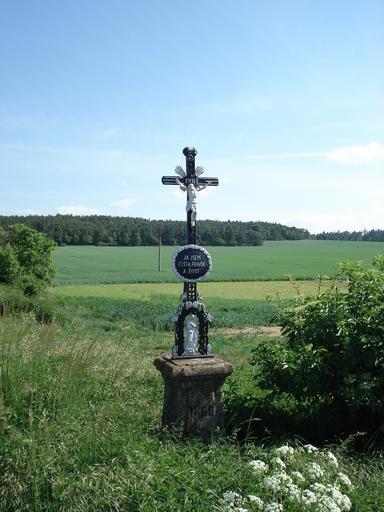 | Keywords: Dukovany Kříž04 Čurdův.jpg cs 4 kříž na cestě do Jamolic- Čurdův Nachází se na odbočce z hlavní cesty směrem k elektrárně Havránek Je umístěn na poli zvaném Vinohrádky Spodní část kříže je kamenná korpus je litinový Pod Kristem je oválná litinová tabulka na které je nápis Já jsem cesta pravda a život Kříž nechali postavit manželé Čurdovi Bylo to v roce 1869 když se manželům Čurdovým Martinu a jeho ženě roz Hudečkové M z Lukova narodil syn Václav Kříž byl několikrát shozen ale vždy opraven vlastní author 1869 Crosses in Vysočina Region Dukovany |