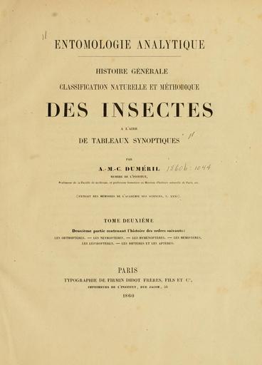 Keywords: DumérilEntomologieAnalytique.jpg en Dumeril C A -M 1806 Zoologie analitique ou methode naturelle de classification des animaux rendue plus facile a l'aide de tableaux synoptiques Paris Allais Libraire Quaides Augustins No 39 344 pp Dumeril C A -M 1806 Analitische Zoologie Aus dem Franz mit Zusatzen von L F Froriep Weimar Verl des Lendes-Industrie-Comptoirs 1-343 AHH Ms Abstract Animaux 1 classis Mammalia 2 classis Aves - Oiseaux 3 classis Reptilia - Reptiles 4 classis Pisces - Poissons 5 classis Mollusca - Mollusques 6 classis Crustacea - Crustaces 7 classis Insecta - Insectes 1 ordo Coleopteres Eleuterata Fab 1 subordo Pentamérés/Pentameriden 1 fam Carnassiers Creophages/Creophagen gen anthia Weber gen cychrus Fab gen tachypus Weber gen carabus Linn gen calosoma Weber gen brachinus Weber gen cicindela gen colliurus de Geer gen manticora Fab gen drypta Fab gen elaphes Elaphrus gen bembidions Bembidion Latreille gen clivina Latr gen scarites Fab gen nothiophilus gen Omophron 2 fam Remipedes Nectopodes/Nectopoden gen dytiscus Lin gen hyphydrus gen haliplus gen gyrinus 3 fam Brevipennes Brachélytres/Brachelytren gen staphylinus Linn gen oxyporus Fabricius gen paederus Fab gen stenus Latreille gen lesteva Latr 4 fam Lamellicornes Petaloceres/Petaloceren gen geotrupes Latreille gen copris Geoff gen aphodius Illiger gen scarabaeus Linn gen melolontha Linn gen cetonia gen trichius Fab gen trox Fabricius 5 fam Serricornes Proiceres/Prioceren gen lucanus Linn gen platycerus Geoffroy gen passalus Fab gen synodendron Fab 6 fam Clavicornes Héloceres/Heloceren gen sphaeridium Fab gen scaphidium Olivier gen nitidula Fab gen silpha Fab gen peltis Geoff gen necrophorus Fab gen elophorus gen parnus Fab gen hydrophilus Geoff gen dermestes Linne gen byrrhus Fab 7 fam Solidicornes Steréocères/Stetreoceren gen lethrus Fab bulbocerus Thunberg gen hister Linne gen anthrenus Fab 8 fam Thoraciques Sternoxes/Sternoxyten gen atopa Paykull gen cebrio Olivier gen elater Linn gen throscus Lat gen buprestis Linne gen trachys Fab 9 fam Percebois Térédiles/Teredylen gen anobium Fab gen ptilinus Geoff Fab gen ptinus Linn gen melasis gen tillus Oliv gen lymexylon 10 fam Mollipennes Apalytres/Apalytern gen drilus Oliv gen lycus Fab gen omalysus Geoffroy gen melyris Olivier gen lampyrus Linn gen malachius Fab gen telephorus de Geer gen cyphon Paykull 2 subordo Hétéromérés/Heteromeriden 11 fam Vésicans Épispastiques/Epispasten gen dasytes Paykull gen lagria Fab gen anthicus Paykull gen notoxus Schaeff gen meloe gen cantharis Geoffroy litta Fabricius gen cerocoma Geoff gen mylabris Fab gen apalus Fab gen zonitis Fab 12 fam Angustipennes Sténoptères/Stenopteren gen sitaris gen oedemera Oliv gen necydalis Fab gen ripiphorus Fab gen mordella Linne gen anaspis 13 fam Sylvicoles Orneophiles/Orneophilen gen helops Fabricius gen serropalpus Olivier gen cistela Fab gen calopus Fab gen pyrochroa Geoff gen horia Fab 14 fam Tenebricoles Lygophiles/Lygophilen gen upis Fab gen tenebrio Linn gen opatrum Fab gen pedinus Latreille gen sarrotrium Illiger 15 fam Lucifuges Photophyges/Phytophygen gen blaps gen pimelia Fab gen eurychora Thunberg gen akis Fab gen scaurus Fab gen sepidium Fab gen erodius Fab gen zophosis Latreille gen tagenia Lat 16 fam Fungivores Mycetobies/Mycetobien gen boletophagus Illiger gen hypophloeus Paukull gen anisotoma Knoch gen agathidium Illiger gen diaperis Geoffroy gen cnodulon Fabr gen tetratoma gen Cossiphe Cossyphus 3 subordo Tetrameres/Tetrameriden 17 fam Rosticornes Rhinoceres/Rhinoceriden gen bruchus Linn mylabris Geoff gen rhinomacer Fab gen anthribus Geoff gen brachycerus Oliv gen attelabus Linne gen oxystoma gen curculio Linne gen ramphus gen rynchaenus Clairville gen brenthus Fab 18 fam Cylindriformes Cylindroides/Cylindroiden gen apate Fab gen bostrichus gen scolitus Geoff gen clerus Linn trichodes Herbst Fab gen corynetes Fab necrobia Lat 19 fam Planiformes Omaloides/Omaloiden gen lyctus gen colydium Paykull gen trogosita Oliv gen cucujes Cucuje Cucujus gen Ips gen mycetophages Mycetophage Mycetophagus gen heterocères Heterocere Heterocerus 20 fam Lignivores Xylophages/Xylophagen gen rhagium Fab gen leptura Linn gen molorchus Fab Necydalis Geoff gen callidium Fab gen saperda Fab gen cerambyx Linn gen lamia Fab gen prionus Fab 21 fam Herbivores Phytophages/Phytophagen gen donacia Fab gen crioceris Geoff Lema Fab gen hispa Fab gen helodes Paukull gen lupeus Geoff gen galeruca Geoff gen altica Geoff gen cryptocephalus Fab gen clythra Laichart gen chrysomela Linn gen alurnus Fab gen erotylus Oliv gen cassida Linn gen spondylis Fab gen cucujus Fab 4 subordo et 22 fam Tridactyles Trimeres/Trimeriden gen dasycerus Brongniart gen eumorphus Weber gen endomychus Paukull gen coccinella Linn gen scymnus Herbst 2 ordo Orthopteres / Orthopteren Olivier fam Forficules Forficula Labidoures/Labidouren gen forficula Linn fam Blattes/Blatten gen blatta Linne fam Difformes Anomides/Anomiden gen mantis Linn gen phyllium Illiger gen phasma Fab fam Grylliformes Gryllus Grylloides/Grylloiden Gryllus gen locusta Fab gen truxalis Fab gen gryllus Linne gen acrydium Geoffr gen acheta Linne Fab gen tridactylus Oliv gen gryllotalpa Linne 3 ordo Nevropteres / Neuropteren 1 fam Tectipennes Stegopteres/Stegopteren gen myrmeleon Linn gen ascalaphus Linn gen termes gen psocus Linn gen hemerobius Linn gen panorpa Linn gen raphidia Linn gen semblis Linn gen perla Linn 2 fam Bucceles Agnathes/Agnathen gen ephemera Linn gen phryganea Linn 3 fam Libelles/Libellen Libellula Odonates/Odonaten gen libellula Linn gen agrion Fab 4 ordo Hyménoptères / Hymenopteren fam Apiaires Apis Mellites/Melliten gen apis Linn gen eucera Fab gen nomada Fab gen andraena Fab gen hylaeus Fab gen bembex Fab fam Duplicipennes Pterodiples / Pterodiplen gen vespa Linn gen masaris Fab fam Chrysides/Chrysiden Chrysis gen parnopes Lat gen chrysis fam Florileges Anthophiles/Anthophilen gen philanthus Fab gen scolia Fab gen crabro Linn gen mell