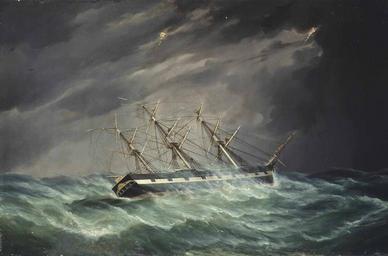 Keywords: Duncan MacFarlane - The emigrant ship ‚Carnatic‘ of Boston in a hurricane.jpg The emigrant ship Carnatic of Boston in a hurricane in the Indian Ocean on a voyage to Calcutta under the command of Captain John Devereux oil on canvas cm 61 91 4 object history Henry Kelsey Devereux of Cleveland Ohio and thence by descent until bequeathed to the late owner credit line signed 'D Mc Farlane/Sen ' lower left accession number christies online 5794042 5317 60 London 5 June 2014 PD-old-100 DEFAULTSORT MacFarlane Duncan; Carnatic; Christies 2014 Duncan MacFarlane painter Carnatic ship 1847 19th-century sailing ships in paintings Sea storms in art |