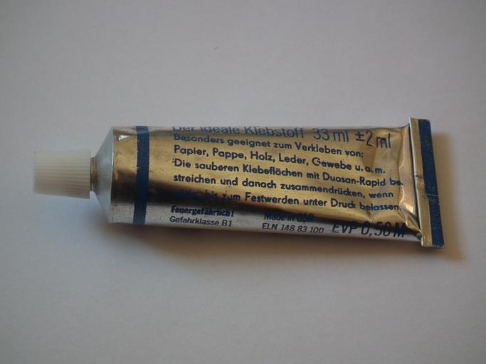 Keywords: Duosan rapid back.JPG en Adhesive Duosan rapid Tube back side de Alleskleber Duosan rapid Tupe Rückseite own Stefan Kühn 2011-01-07 Cc-zero Tubes packaging Photographs by User Stefan Kühn Back of objects