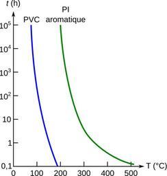 Keywords: Duree vie polymere temperature.svg en Lifetime in hour of a polymer depending on the temperature in °C polyvinyl chloride and aromatic polyimide fr Durée de vie en heures d'un polymère en fonctiond e la température en °C polychlorure de vinyl et polyimide aromatique own from J P Trotignon M Piperaud J verdu A Dobraczynski Précis de matières plastiques ed Nathan/Afnor Paris 1993 p 1 Cdang 2011-05-10 inkscape Cc-zero Polymer diagrams |