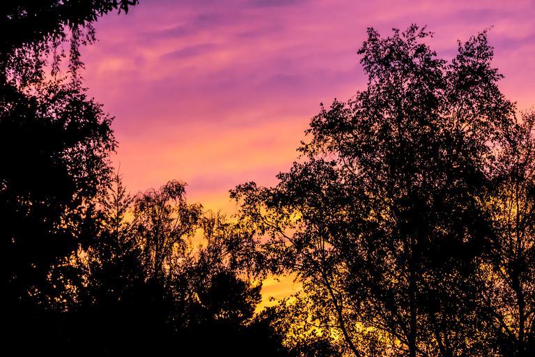 Keywords: dusk sky glow yellow orange purple red back light autumn trees tree plant evening abendstimmung mood twilight evening sky sunset clouds dark