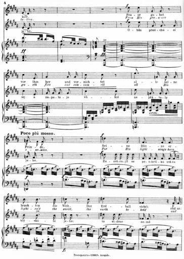 | Keywords: Dvorak's Biblicke Pisne i-4.jpg Dvorak's_Biblicke_Pisne_i- jpg 3 5 Antonín Dvořák's Biblícké Písně Biblical Songs Op 99 1884 Book 1 containing Songs 1-5 While Dvorak later orchestrated the work this the complete original piano-and-voice version While the massacre of the original music to fit the German and English is appalling it does contain the original Czech and the original music for the Czech The German and English should probably be considered only as a translation This is the first five songs out of ten the other five are printed in a second volume I have not yet tracked down I haven't been able to find Book 2 unfortunately 1895 copy in my own possession The only copyright claimed on the sheet music itself is to N Simrock which is a publishing house Antonin Dvorak PD-Old Original Czech From http //music ibiblio org/pub/multimedia/pandora/vorbis/contrib/Marta_Chaloupka_Live/Czech notes accompanying the Pandora Music recording 1 Psalm 97 2-6 Oblak a mrákota jest vůkol Něho spravedlnost a soud základ trůnu Jeho Oheň předchází jej a zapaluje vůkol nepřátele Jeho Zasvěcujíť se po okršlku světa blýskání Jeho; to vidouc země děsí se Hory jako vosk rozplývají se před obličejem Hospodina panovníka vší země a slávu jeho spatřují všichni národové 2 Psalms 119 114-117 119 120 Skrýše má a pavéza má Ty jsi na slovo Tvé očekávám Odstuptež ode mne nešlechetníci abych ostříhal přikázaní Boha svého Posiluj mne bych zachován byl a patřil k ustanovením Tvým ustavičně Děsí se strachem před Tebou tělo mé; nebo soudů Tvých bojím se náramně 3 Psams 55 1 2 4/5 6 7 8 Slyš ó Bože Slyš modlitbu mou a neskrývej se před prosbou mou Pozoruj a vyslyš mne neboť naříkám v úpění svém a kormoutím se Srdce mé tesklí ve mně a strachové smrti přišli na mne a hrůza přikvačila mne I řekl jsem Ó bych měl křídla jako holubice zaletěl bych a poodpočinul Aj daleko bych se vzdálil a přebýval bych na poušti Pospíšil bych ujíti větru prudkému a vichřici 4 Psalms 23 1-4 Hospodin jest můj pastýř nebudu míti nedostatku Na pastvách zelených pase mne k vodám tichým mne přivodí Duši mou občerstvuje vodí mne po stezkách spravedlnosti pro jméno své Byť mi se dostalo jíti přes údolí stínu smrti nebuduť se báti zlého nebo Ty se mnou jsi; a prut Tvůj a hůl Tvá toť mne potěšuje 5 Psalms 144 9 145 1-3 5 6 Bože Bože píseň novou zpívati budu Tobě na loutně a žalmy tobě prozpěvovati Na každý den dobrořečiti budu Tobě a chváliti jméno Tvé na věky věků Hospodin jistě veliký jest a vší chvály hodný a velikost jeho nemůž vystižena býti O slávě a kráse a velebnosti Tvé i o věcech Tvých předivných mluviti budu A moc přehrozných skutků Tvých vsichni rozhlašovati budou; i já důstojnost Tvou budu vypravovati 6 Psalms 61 1 3 4 63 1 4/5 Slyš ó Bože volání mé pozoruj modlitby mé Nebo jsi býval útočiště mé a pevná věže před tváří nepřítele Buduť bydliti v stánku tvém na věky schráním se v skrýši křídel tvých Bože Bůh silný můj ty jsi tebeť hned v jitře hledám Tebe žízní duše má po tobě touží tělo mé v zemi žíznivé a vyprahlé v níž není vody A tak abych tobě dobrořečil a s radostným rtů prozpěvováním chválila by tě ústa má 7 Psalms 137 1-5 Při řekách Babylonských tam jsme sedávali a plakávali rozpomínajíce se na Sion Na vrbí v té zemi zavěšovali jsme citary své když se tam dotazovali nás ti kteříž nás zajali na slova písničky říkajíce Zpívejte nám některou píseň Sionskou Odpovídali jsme Kterakž bychom mohli zpívati píseň Hospodinovu v zemi cizozemců Jestliže se zapomenu na tebe ó Jeruzaléme ó zapomeniž i pravice má umění svého 8 Psalms 25 16-18 20 Popatřiž na mne a smiluj se nade mnou neboť jsem opuštěný a strápený Soužení srdce mého rozmnožují se z úzkostí mých vyveď mne z úzkostí mých vyveď mne Smiluj se nade mnou Viz trápení mé a bídu mou a odpusť všecky hříchy mé Ostříhej duše mé a vytrhni mne ať nejsem zahanben neboť v tebe doufám neboť v tebe doufám 9 Psalms 121 1-4 Pozdvihuji očí svých k horám odkud by mi přišla pomoc Pomoc má jest od Hospodina kterýž učinil nebe i zemi Nedopustíť aby se pohnouti měla noha tvá nebo nedřímeť strážný tvůj Aj nedřímeť ovšem nespí ten kterýž ostříhá Izraele 10 Psalms 98 1 4/5 7 8 96 12/11 Zpívejte Hospodinu píseň novou neboť jest divné věci učinil Zvuk vydejte prozpěvujte a žalmy zpívejte Zvuč moře i to což v něm jest okršlek světa i ti což na něm bydlí Řeky rukama plésejte spolu s nimi i hory prozpěvujte Plésej pole a vše což na něm plésej země zvuč i moře i což v něm jest Biblické písně Psalm 97 Biblické písně Music in 1894 Christianity in the Czech Republic Czech language |