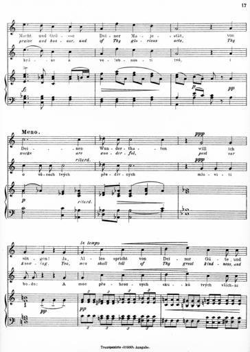 Keywords: Dvorak's Biblicke Pisne i-17.jpg Dvorak's_Biblicke_Pisne_i- jpg 16 18 Antonín Dvořák's Biblícké Písně Biblical Songs Op 99 1884 Book 1 containing Songs 1-5 While Dvorak later orchestrated the work this the complete original piano-and-voice version While the massacre of the original music to fit the German and English is appalling it does contain the original Czech and the original music for the Czech The German and English should probably be considered only as a translation This is the first five songs out of ten the other five are printed in a second volume I have not yet tracked down I haven't been able to find Book 2 unfortunately 1895 copy in my own possession The only copyright claimed on the sheet music itself is to N Simrock which is a publishing house Antonín Dvořák 1841 1904 PD-Old Original Czech From http //music ibiblio org/pub/multimedia/pandora/vorbis/contrib/Marta_Chaloupka_Live/Czech notes accompanying the Pandora Music recording 1 Psalm 97 2-6 Oblak a mrákota jest vůkol Něho spravedlnost a soud základ trůnu Jeho Oheň předchází jej a zapaluje vůkol nepřátele Jeho Zasvěcujíť se po okršlku světa blýskání Jeho; to vidouc země děsí se Hory jako vosk rozplývají se před obličejem Hospodina panovníka vší země a slávu jeho spatřují všichni národové 2 Psalms 119 114-117 119 120 Skrýše má a pavéza má Ty jsi na slovo Tvé očekávám Odstuptež ode mne nešlechetníci abych ostříhal přikázaní Boha svého Posiluj mne bych zachován byl a patřil k ustanovením Tvým ustavičně Děsí se strachem před Tebou tělo mé; nebo soudů Tvých bojím se náramně 3 Psams 55 1 2 4/5 6 7 8 Slyš ó Bože Slyš modlitbu mou a neskrývej se před prosbou mou Pozoruj a vyslyš mne neboť naříkám v úpění svém a kormoutím se Srdce mé tesklí ve mně a strachové smrti přišli na mne a hrůza přikvačila mne I řekl jsem Ó bych měl křídla jako holubice zaletěl bych a poodpočinul Aj daleko bych se vzdálil a přebýval bych na poušti Pospíšil bych ujíti větru prudkému a vichřici 4 Psalms 23 1-4 Hospodin jest můj pastýř nebudu míti nedostatku Na pastvách zelených pase mne k vodám tichým mne přivodí Duši mou občerstvuje vodí mne po stezkách spravedlnosti pro jméno své Byť mi se dostalo jíti přes údolí stínu smrti nebuduť se báti zlého nebo Ty se mnou jsi; a prut Tvůj a hůl Tvá toť mne potěšuje 5 Psalms 144 9 145 1-3 5 6 Bože Bože píseň novou zpívati budu Tobě na loutně a žalmy tobě prozpěvovati Na každý den dobrořečiti budu Tobě a chváliti jméno Tvé na věky věků Hospodin jistě veliký jest a vší chvály hodný a velikost jeho nemůž vystižena býti O slávě a kráse a velebnosti Tvé i o věcech Tvých předivných mluviti budu A moc přehrozných skutků Tvých vsichni rozhlašovati budou; i já důstojnost Tvou budu vypravovati 6 Psalms 61 1 3 4 63 1 4/5 Slyš ó Bože volání mé pozoruj modlitby mé Nebo jsi býval útočiště mé a pevná věže před tváří nepřítele Buduť bydliti v stánku tvém na věky schráním se v skrýši křídel tvých Bože Bůh silný můj ty jsi tebeť hned v jitře hledám Tebe žízní duše má po tobě touží tělo mé v zemi žíznivé a vyprahlé v níž není vody A tak abych tobě dobrořečil a s radostným rtů prozpěvováním chválila by tě ústa má 7 Psalms 137 1-5 Při řekách Babylonských tam jsme sedávali a plakávali rozpomínajíce se na Sion Na vrbí v té zemi zavěšovali jsme citary své když se tam dotazovali nás ti kteříž nás zajali na slova písničky říkajíce Zpívejte nám některou píseň Sionskou Odpovídali jsme Kterakž bychom mohli zpívati píseň Hospodinovu v zemi cizozemců Jestliže se zapomenu na tebe ó Jeruzaléme ó zapomeniž i pravice má umění svého 8 Psalms 25 16-18 20 Popatřiž na mne a smiluj se nade mnou neboť jsem opuštěný a strápený Soužení srdce mého rozmnožují se z úzkostí mých vyveď mne z úzkostí mých vyveď mne Smiluj se nade mnou Viz trápení mé a bídu mou a odpusť všecky hříchy mé Ostříhej duše mé a vytrhni mne ať nejsem zahanben neboť v tebe doufám neboť v tebe doufám 9 Psalms 121 1-4 Pozdvihuji očí svých k horám odkud by mi přišla pomoc Pomoc má jest od Hospodina kterýž učinil nebe i zemi Nedopustíť aby se pohnouti měla noha tvá nebo nedřímeť strážný tvůj Aj nedřímeť ovšem nespí ten kterýž ostříhá Izraele 10 Psalms 98 1 4/5 7 8 96 12/11 Zpívejte Hospodinu píseň novou neboť jest divné věci učinil Zvuk vydejte prozpěvujte a žalmy zpívejte Zvuč moře i to což v něm jest okršlek světa i ti což na něm bydlí Řeky rukama plésejte spolu s nimi i hory prozpěvujte Plésej pole a vše což na něm plésej země zvuč i moře i což v něm jest Biblické písně Psalm 144 |