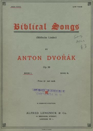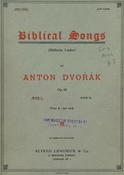 Keywords: Dvorak's Biblicke Pisne i-1.jpg Dvorak's_Biblicke_Pisne_i- jpg 2 Antonín Dvořák's Biblícké Písně Biblical Songs Op 99 1894 Book 1 containing Songs 1-5 While Dvorak later orchestrated the work this the complete original piano-and-voice version While the massacre of the original music to fit the German and English is appalling it does contain the original Czech and the original music for the Czech The German and English should probably be considered only as a translation This is the first five songs out of ten the other five are printed in a second volume I have not yet tracked down I haven't been able to find Book 2 unfortunately 1895 copy in my own possession The only copyright claimed on the sheet music itself is to N Simrock which is a publishing house Antonín Dvořák 1841 1904 PD-Old Original Czech From http //music ibiblio org/pub/multimedia/pandora/vorbis/contrib/Marta_Chaloupka_Live/Czech notes accompanying the Pandora Music recording 1 Psalm 97 2-6 Oblak a mrákota jest vůkol Něho spravedlnost a soud základ trůnu Jeho Oheň předchází jej a zapaluje vůkol nepřátele Jeho Zasvěcujíť se po okršlku světa blýskání Jeho; to vidouc země děsí se Hory jako vosk rozplývají se před obličejem Hospodina panovníka vší země a slávu jeho spatřují všichni národové 2 Psalms 119 114-117 119 120 Skrýše má a pavéza má Ty jsi na slovo Tvé očekávám Odstuptež ode mne nešlechetníci abych ostříhal přikázaní Boha svého Posiluj mne bych zachován byl a patřil k ustanovením Tvým ustavičně Děsí se strachem před Tebou tělo mé; nebo soudů Tvých bojím se náramně 3 Psams 55 1 2 4/5 6 7 8 Slyš ó Bože Slyš modlitbu mou a neskrývej se před prosbou mou Pozoruj a vyslyš mne neboť naříkám v úpění svém a kormoutím se Srdce mé tesklí ve mně a strachové smrti přišli na mne a hrůza přikvačila mne I řekl jsem Ó bych měl křídla jako holubice zaletěl bych a poodpočinul Aj daleko bych se vzdálil a přebýval bych na poušti Pospíšil bych ujíti větru prudkému a vichřici 4 Psalms 23 1-4 Hospodin jest můj pastýř nebudu míti nedostatku Na pastvách zelených pase mne k vodám tichým mne přivodí Duši mou občerstvuje vodí mne po stezkách spravedlnosti pro jméno své Byť mi se dostalo jíti přes údolí stínu smrti nebuduť se báti zlého nebo Ty se mnou jsi; a prut Tvůj a hůl Tvá toť mne potěšuje 5 Psalms 144 9 145 1-3 5 6 Bože Bože píseň novou zpívati budu Tobě na loutně a žalmy tobě prozpěvovati Na každý den dobrořečiti budu Tobě a chváliti jméno Tvé na věky věků Hospodin jistě veliký jest a vší chvály hodný a velikost jeho nemůž vystižena býti O slávě a kráse a velebnosti Tvé i o věcech Tvých předivných mluviti budu A moc přehrozných skutků Tvých vsichni rozhlašovati budou; i já důstojnost Tvou budu vypravovati 6 Psalms 61 1 3 4 63 1 4/5 Slyš ó Bože volání mé pozoruj modlitby mé Nebo jsi býval útočiště mé a pevná věže před tváří nepřítele Buduť bydliti v stánku tvém na věky schráním se v skrýši křídel tvých Bože Bůh silný můj ty jsi tebeť hned v jitře hledám Tebe žízní duše má po tobě touží tělo mé v zemi žíznivé a vyprahlé v níž není vody A tak abych tobě dobrořečil a s radostným rtů prozpěvováním chválila by tě ústa má 7 Psalms 137 1-5 Při řekách Babylonských tam jsme sedávali a plakávali rozpomínajíce se na Sion Na vrbí v té zemi zavěšovali jsme citary své když se tam dotazovali nás ti kteříž nás zajali na slova písničky říkajíce Zpívejte nám některou píseň Sionskou Odpovídali jsme Kterakž bychom mohli zpívati píseň Hospodinovu v zemi cizozemců Jestliže se zapomenu na tebe ó Jeruzaléme ó zapomeniž i pravice má umění svého 8 Psalms 25 16-18 20 Popatřiž na mne a smiluj se nade mnou neboť jsem opuštěný a strápený Soužení srdce mého rozmnožují se z úzkostí mých vyveď mne z úzkostí mých vyveď mne Smiluj se nade mnou Viz trápení mé a bídu mou a odpusť všecky hříchy mé Ostříhej duše mé a vytrhni mne ať nejsem zahanben neboť v tebe doufám neboť v tebe doufám 9 Psalms 121 1-4 Pozdvihuji očí svých k horám odkud by mi přišla pomoc Pomoc má jest od Hospodina kterýž učinil nebe i zemi Nedopustíť aby se pohnouti měla noha tvá nebo nedřímeť strážný tvůj Aj nedřímeť ovšem nespí ten kterýž ostříhá Izraele 10 Psalms 98 1 4/5 7 8 96 12/11 Zpívejte Hospodinu píseň novou neboť jest divné věci učinil Zvuk vydejte prozpěvujte a žalmy zpívejte Zvuč moře i to což v něm jest okršlek světa i ti což na něm bydlí Řeky rukama plésejte spolu s nimi i hory prozpěvujte Plésej pole a vše což na něm plésej země zvuč i moře i což v něm jest Biblické písně Biblické písně 1894 Christianity in the Czech Republic Czech language |