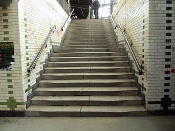Keywords: Dworzec Gdańsk Oliwa (5).JPG pl Dworzec Gdańsk Oliwa schody na peron dalekobieżny own Artur Andrzej 2011-10-15 Cc-zero Gdańsk Oliwa train station Stairs in Gdańsk