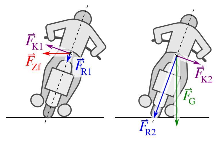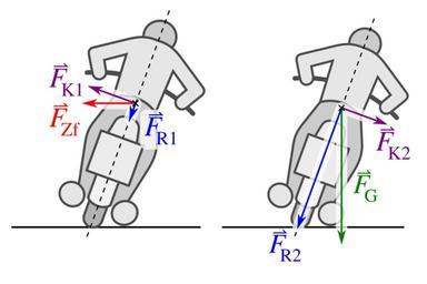Keywords: Dynamisches-gleichgewicht-motorrad-kurvenfahrt-v2.svg de D'Alembertsche Trägheitskraft hält den Motorradfahrer bei der Kurvenfahrt in Schräglage Die durch die Schräglage verursachte Kippkraft F<sub>K2</sub> gleicht die von der Zentrifugalkraft ausgehende Kippkraft F<sub>K1</sub> aus Der zweite Teil der Kräftezerlegung die Reifenkraft F<sub>R1</sub> F<sub>R2</sub> addiert sich und presst den Reifen auf die Unterlage 2012-05-29 own Stündle Inkscape cc-zero Uploaded with UploadWizard Dynamics |