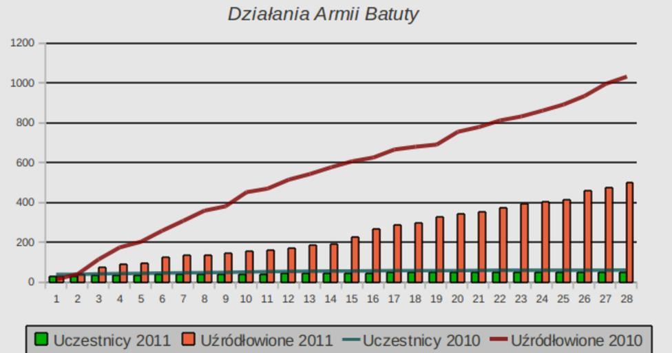 Keywords: Działania Armii Batuty 2011.png pl Liczba uczestników akcji batuta oraz uźródłowionych haseł w 2011 Porównanie z rokiem 2010 own Przykuta 2011-02-16 Cc-zero Polish Wikipedia statistics BATUTA