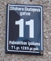 Keywords: Džohara Dudajeva gatve.jpg Табличка с надписью улица Джоха а Дудаева в Риге own 2004-07-19 User Otto Magnus GFDL relicense Street signs in Riga 11 house number Dzhokhar Dudayev