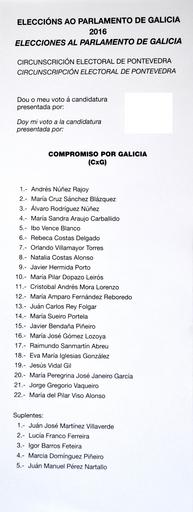 Keywords: E. ao Parlamento de Galicia 2016. C. E. de Pontevedra. CxG.jpg gl Eleccións ao Parlamento de Galicia 2016 Circunscrición Electoral de Pontevedra 2016-09-25 13 56 27 own HombreDHojalata other versions cc-zero PD-SpanishGov es se borro el logotipo del partido político por copyright borrouse o logotipo do partido político por copyright Ballot papers for the 2016 Galician parliamentary election for the province of Pontevedra All medias supported by Wikimedia España in 2016 Ballot papers for Compromiso por Galicia |