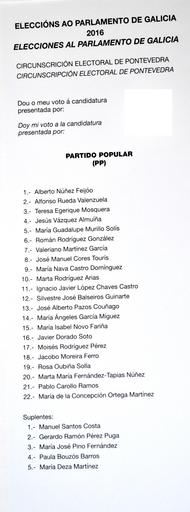 Keywords: E. ao Parlamento de Galicia 2016. C. E. de Pontevedra. PP.jpg gl Eleccións ao Parlamento de Galicia 2016 Circunscrición Electoral de Pontevedra 2016-09-25 13 59 47 own HombreDHojalata other versions cc-zero PD-SpanishGov es se borro el logotipo del partido político por copyright borrouse o logotipo do partido político por copyright Ballot papers for the 2016 Galician parliamentary election for the province of Pontevedra All medias supported by Wikimedia España in 2016 Ballot papers for Partido Popular Alberto Núñez Feijóo |