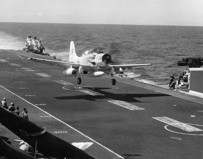 Keywords: EA-1F VAW-13 HMS Victorious 1963.jpeg A U S Navy Douglas EA-1F Skyraider of electronic warfare squadron VAW-13 Zappers making a touch-and-go landing on the British aircraft carrier HMS Victorious R38 off Cubi Point Philippines in late 1963 during a five-day exercise of U S British and Australian carriers Note the two Westland Wessex helicopters parked on the fantail and the folded wings of a DeHavilland Sea Vixen fighter in the foreground U S Navy Naval Aviation News February 1964 http //www history navy mil/nan/backissues/1960s/1964/feb64 pdf; also US National Museum of Naval Aviation photo No 1996 253 2283 http //collections naval aviation museum/emuwebdoncoms/pages/doncoms/Display php irn 16035177 QueryPage 2FAdvQuery php 1963 USN PD-USGov-Military-Navy AD-5 A-1E Skyraider AD-5Q EA-1F Skyraider HMS Victorious R38 Electronic Attack Squadron 130 United States Navy |