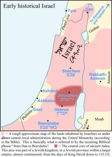Keywords: Early-Historical-Israel-Dan-Beersheba-Judea.png In this graphic about early historical Israel the pink area is a rough approximate map of the near-maximum boundaries of the lands that were inhabited by Israelites or under direct central royal administration during the United Monarchy period of ancient history according to the Bible -- excluding states such as Damascus Geshur Ammon Moab Edom and the Philistine city-states which sometimes acknowledged some degree of Israelite suzerainty or overlordship but were never integral or directly-administered parts of the unified Israelite kingdom of David or Solomon This is basically what is referred to by the Biblical phrase from Dan to Beersheba which occurs nine times in the Hebrew Bible / Old Testament -- at Judges 20 1 1 Samuel 3 20 2 Samuel 3 10 2 Samuel 17 11 2 Samuel 24 2 2 Samuel 24 15 1 Kings 4 25 1 Chronicles 21 2 and 2 Chronicles 30 5 So the passage 1 Kings 4 24-25 1 Kings 5 4-5 in Jewish verse numbering describes Solomon's larger empire with the phrase from Tiphsah to Gaza these being the northeasternmost and southwesternmost noteworthy cities that recognized some allegiance to Solomon Tiphsah was a trade outpost in northern Syria at the bend in the Upper Euphrates but the actual land where Judah and Israel dwelt in safety was described as being from Dan to Beersheba The dark red area in the graphic shows the central core of ancient Judea This area more or less the southern half of the west bank hill-chain roughly from Ramallah to Hebron or slightly north of Hebron was almost always part of a Jewish kingdom or a Jewish province within a larger empire for over a thousand years from the days of King David down to 135 CE The only cities shown on the map were capital cities or were important landmarks in demarcating ancient Israel or Judea The areas to the immediate south and east of the map frame were more sparsely inhabited with a lower proportion of settled agriculture so that boundaries were rather indefinite there The borders of the 1923-1947 British mandate territory i e the modern Israel + West Bank + Gaza are shown in grey Own based on visual inspection not scanning of a variety of sources the single most important source probably being the Administrative Districts of Solomon's Kingdom Map map no 113 on page 86 of the MacMillan Bible Atlas 3rd edition 1993 by Yohanan Aharoni Michael Avi-Yonah Anson F Rainey and Ze'ev Safrai ISBN 0025006053 and to a lesser degree the Kingdom of David Map map no 104 on page 80 2005-09 AnonMoos For a somewhat equivalent French map see File Map Israel Judea 926 BC-fr svg This graphic is also available in resizable vector PDF format on request various technical and font problems have made an SVG conversion difficult historical map Derived versions With alternate map title and elimination of map legend at bottom Image Early-Historical-Israel-Dan-Beersheba-Judea-Corrected png Chinese partial translation Image Early-Historical-Israel-Dan-Beersheba-Judea-Chinese png page edits 1 date/time username edit summary ---- 19 25 24 September 2005 en User AnonMoos †’Summary - additional explanation ---- 04 50 23 September 2005 en User AnonMoos other map ---- 19 12 14 September 2005 en User AnonMoos category ---- 16 05 13 September 2005 en User AnonMoos In this graphic about early historical Israel the pink area is a rough approximate map of the near-maximum boundaries of the lands that were inhabited by Israelites or under direct central royal administration during the United Monarchy period en wikipedia File upload history 12 57 19 September 2005 en User AnonMoos AnonMoos en User_talk AnonMoos Talk 860x1210 59529 bytes Added arrow pointing to location of Edom 16 05 13 September 2005 en User AnonMoos AnonMoos en User_talk AnonMoos Talk 860x1210 58639 bytes In this graphic about early historical Israel the pink area is a rough approximate map of the near-maximum boundaries of the lands that were inhabited by Israelites or under direct central royal administration during the United Monarchy period Maps of the Kingdom of Israel Maps of Philistia Maps of Palestine in 10th century BC |