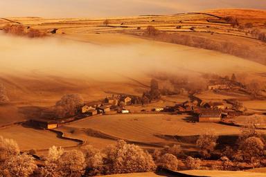 Keywords: cloud dawn early fog foggy hill hills land landscape light mist misty morning nature rural sunrise valley weather orange farm