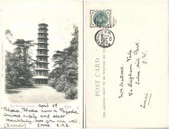 Keywords: public domain publicdomain text drawing sketch I believe that this is the earliest real photo postcard of Kew Gardens that I own. Postmarked Streatham, 16 April 1901. Sent by "C.M.S" to a Mrs Shattock, 84 Leigham Vale, Tulse Hill Park, London. This would appear to be the house on Google Street View - maps.google.co.uk/maps?q=84+Leigham+Vale,+Lambeth&hl=... and see comment below for more details about Alice Shattock, and the possibility that 'C.M.S' is her daughter Constance M. I believe that this is the earliest real photo postcard of Kew Gardens that I own. Postmarked Streatham, 16 April 1901. Sent by "C.M.S" to a Mrs Shattock, 84 Leigham Vale, Tulse Hill Park, London. This would appear to be the house on Google Street View - maps.google.co.uk/maps?q=84+Leigham+Vale,+Lambeth&hl=... and see comment below for more details about Alice Shattock, and the possibility that 'C.M.S' is her daughter Constance M. |