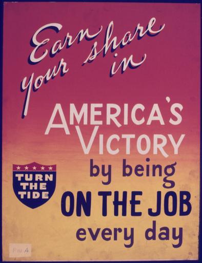 Keywords: Earn Your Share in America's Victory by Being on the Job every day - NARA - 534673.jpg Scope and content General notes 534673 Local identifier 179-WP-822 Office for Emergency Management War Production Board 01/1942 - 11/03/1945 Still Picture Records Section Special Media Archives Services Division NWCS-S National Archives at College Park 8601 Adelphi Road College Park MD 20740-6001 other date circa 1942 1943 Record group Record Group 179 Records of the War Production Board 1918 - 1947 Record group ARC 508 War Production Board compiled 1942 - 1943 Series ARC 533858 File unit File unit ARC Variant control numbers NAIL Control Number NWDNS-179-WP-822 Other versions <gallery> File Earn_Your_Share_in_America's_Victory_by_Being_on_the_Job_every_day_-_NARA_-_534673 tif tif File Earn_Your_Share_in_America's_Victory_by_Being_on_the_Job_every_day_-_NARA_-_534673 jpg jpg </gallery> NARA-cooperation PD-USGov World War II absenteeism posters from the United States World War II posters from the United States |