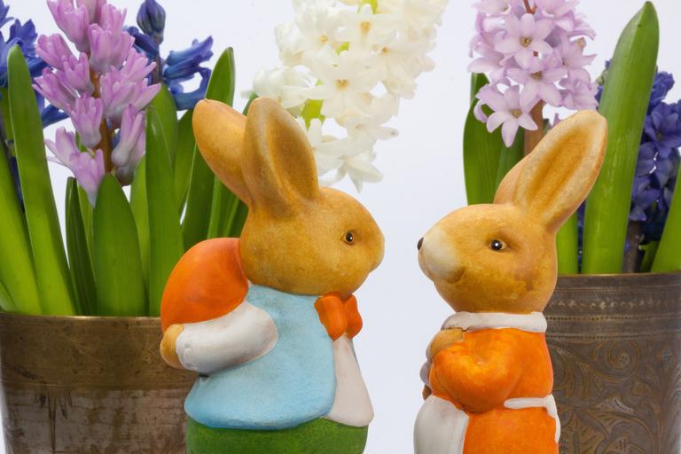 Keywords: easter bunny easter hare bunny couple osterhasen few fig pair customs custom easter egg colorful painted hyacinth hyacinth hyacinthus orientalis asparagaceae asparagus plant green pink white blue orange man woman lovers ear rabbit ear love easter figure couple cute brass vase brass mug