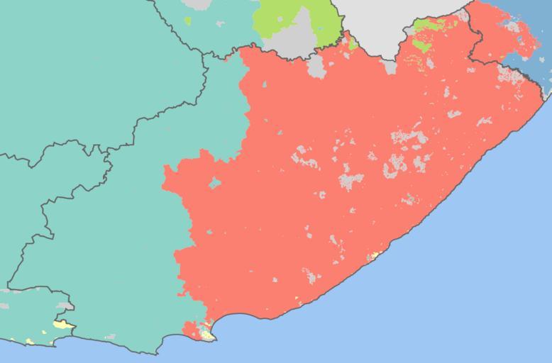Keywords: Eastern Cape 2001 dominant language map.svg 8dd3c7 Afrikaans ffffb3 English fb8072 isiXhosa 80b1d3 isiZulu b3de69 Sesotho d0d0d0 No language dominant Statistics South Africa's Census 2001 is the source of the basic population data The map results from my own processing of the data Htonl 2010-02-10 Htonl The following license applies to the population data on which the map is based http //www statssa gov za/copyrightdisclaimer asp the user acknowledges Stats SA as the source of the basic data wherever they process apply utilise publish or distribute the data and also that they specify that the relevant application and analysis where applicable result from their own processing of the data The following tag applies to the map itself Linguistic maps of South Africa Maps of the Eastern Cape Maps by Htonl |
